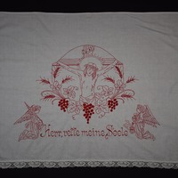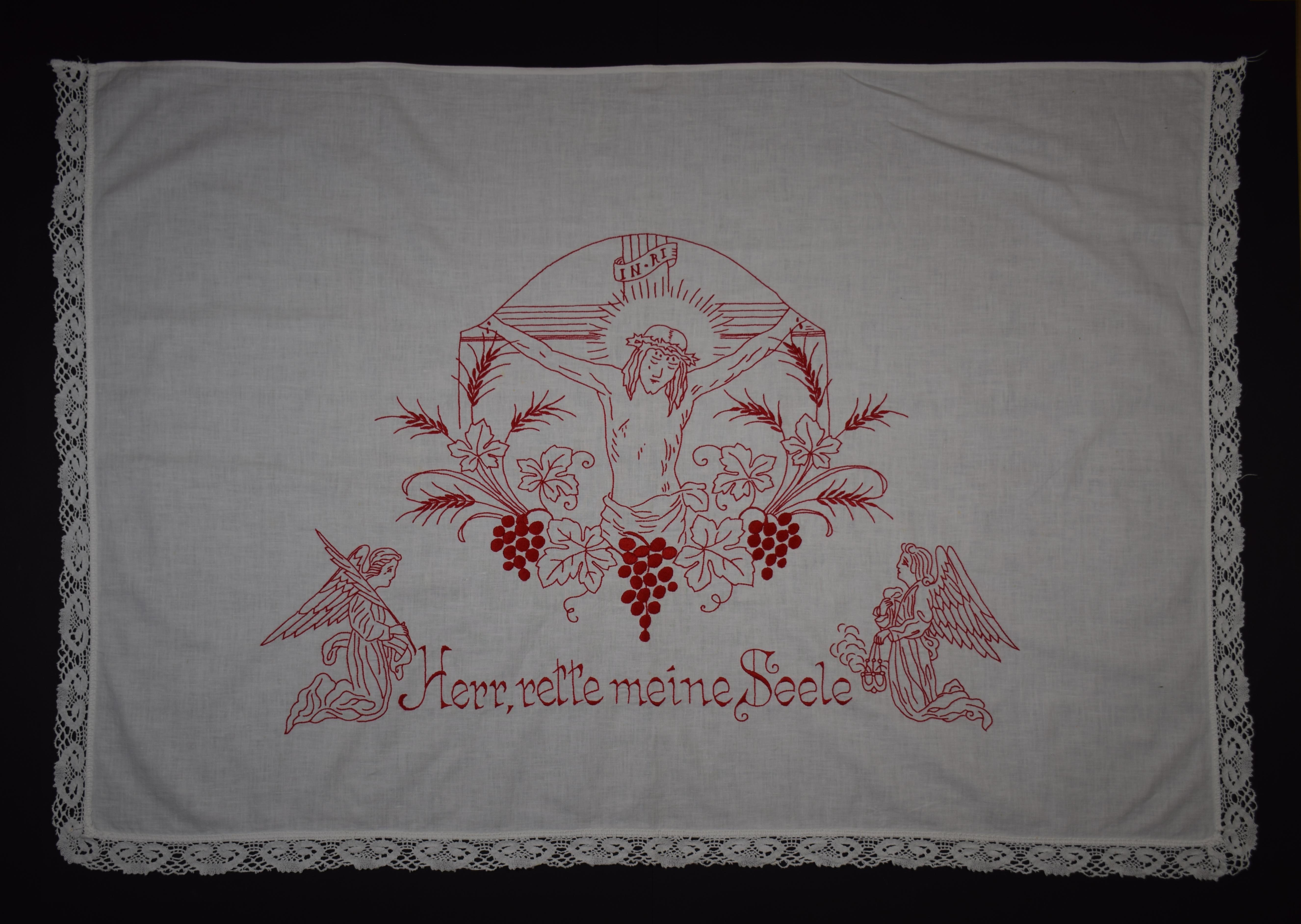 Rot besticktes Versehtuch, das auf drei Seiten mit Spitzen eingefasst ist. Die Motive sind unter anderem mit Stielstich gearbeitet und mit Plattstich unterlegt. Dargestellt ist ein Halbfigur-Porträt von Jesus am Kreuz. Dieses Motiv wird von Weinranken und Ähren eingerahmt. Darunter befindet sich ein Spruch, der links und rechts von einem Engel mit einer Feder und einem Engel mit einem Weihrauchfass begrenzt wird. Der Spruch lautet: "Herr, rette meine Seele"