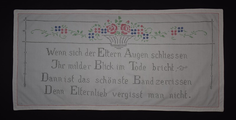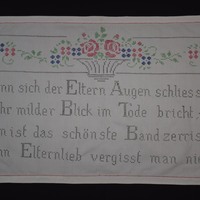 Mehrfarbig bestickter Wandbehang, der mit einem roten Zick-Zack Muster eingesäumt ist. Die Motive sind vor allem mit Kreuzstich gearbeitet. Im oberen Bereich des Tuches ist ein mit Grün, Blau und Rot gestickter Blumenkorb dargestellt. Dieses Motiv wird von einem schwarzen Rahmen eingefasst. Darunter ist ebenfalls in Schwarz der folgenden Spruch gestickt: "Wenn sich der Eltern Augen schliessen / Ihr milder Blick im Tode bricht / Dann ist das schönste Band zerrissen / Denn Elternlieb vergisst man nicht".