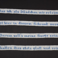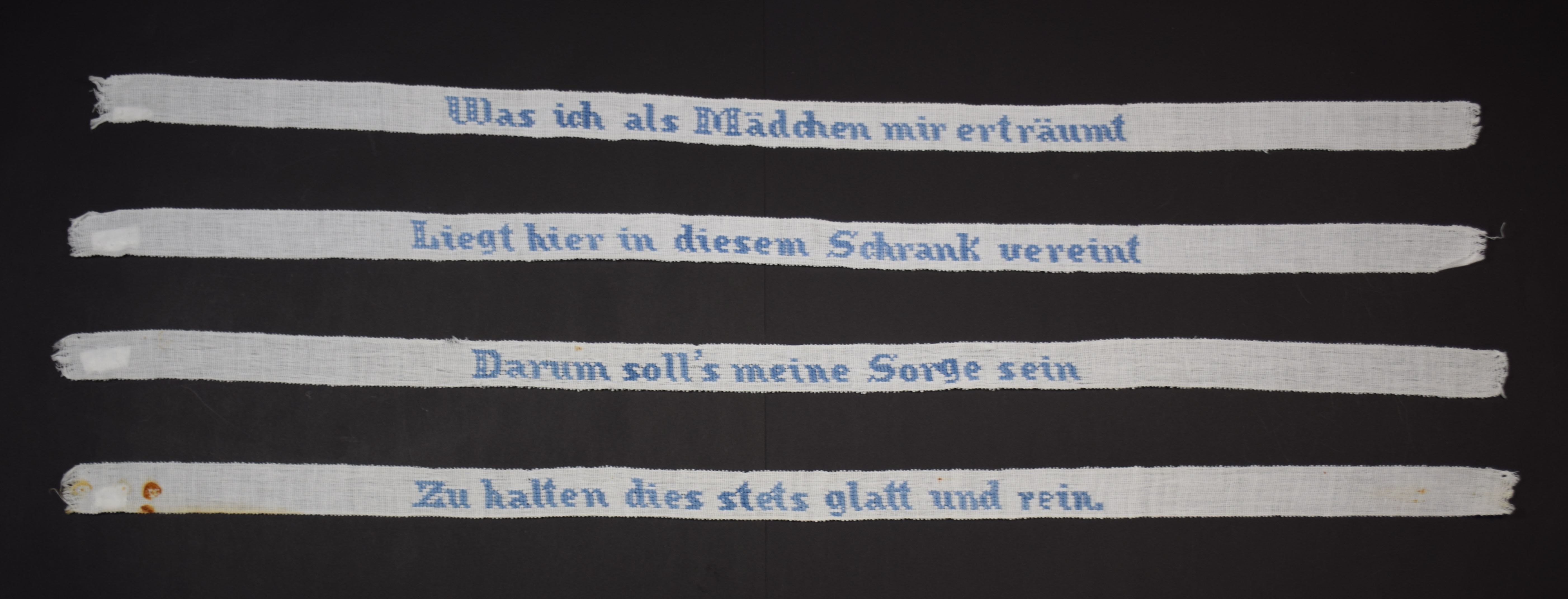 Vier blau bestickte Spruchbänder. Der Spruch, der auf alle vier Bänder aufgeteilt ist, wurde mit Kreuzstichen gestickt und lautet: "Was ich als Mädchen mir erträumt / Liegt hier in diesem Schrank vereint / Darum soll's meine Sorge sein / Zu halten dies stets glatt und rein."