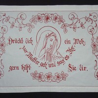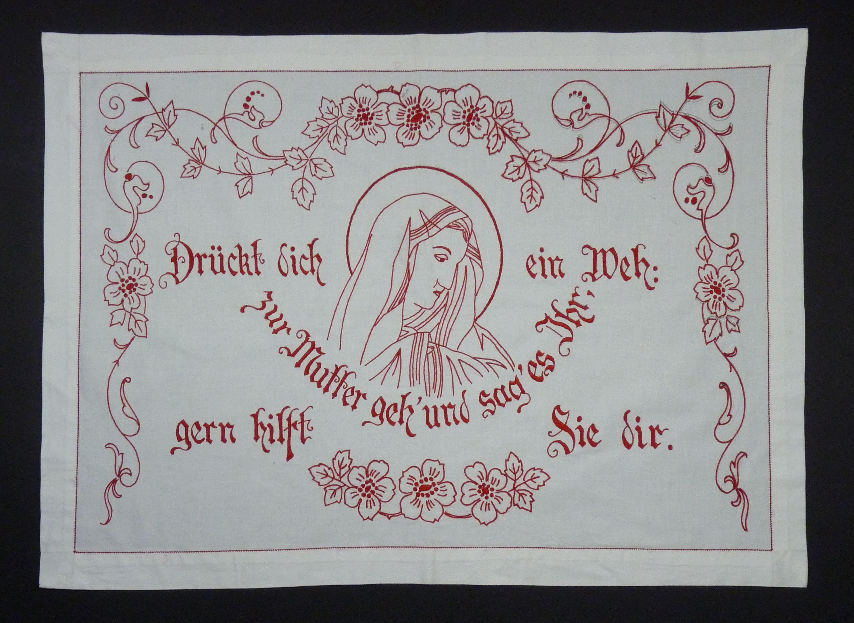 - Rot besticktes Spruchtuch. In der Mitte des Tuches ist das Porträt einer Frau, die mit einem Tuch bekleidet ist (Jungfrau Maria?). Dieses Porträt wird von Ornamenten, Blumenranken und einem Spruch umgeben. Dieser Spruch lautet: "Drückt dich ein Weh: / zur Mutter geh' und sag' es Ihr, / gern hilft Sie dir."