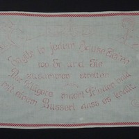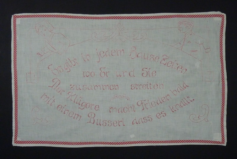 Rot besticktes Spruchtuch, das mit einem karierten Textilband umrandet ist. Das Motiv zeigt eine Frau auf der linken Seite, die vor dem Mann auf der rechten Seite davon zu laufen scheint. Darunter steht der Spruch: "Es gibt in jedem Hause Zeiten / wo Er und sie / zusammen streiten / Der Klügere macht Frieden bald / mit einem Busserl dass es knallt".