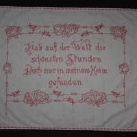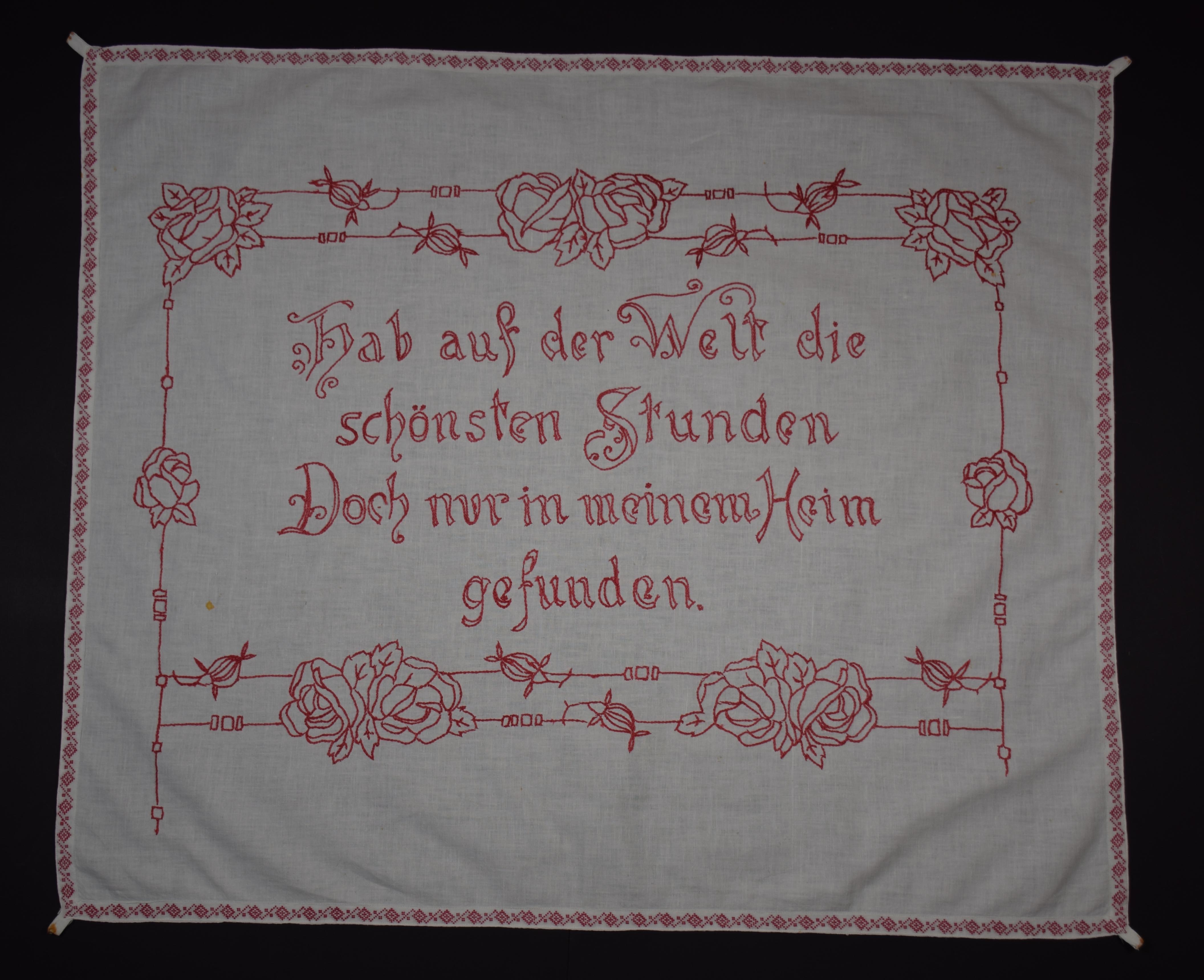 Rot besticktes Spruchtuch, das mit einem Zierband eingefasst wird. In allen vier Ecken befinden sich Schrägbänder, die dazu dienen das Tuch aufzuhängen. Die Motive sind vor allem mit Stielstich gearbeitet. Dargestellt sind Blumenranken, die den folgenden Spruch rahmen: "Hab auf der Welt die / schönsten Stunden / Doch nur in meinem Heim / gefunden."