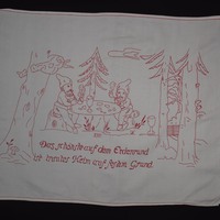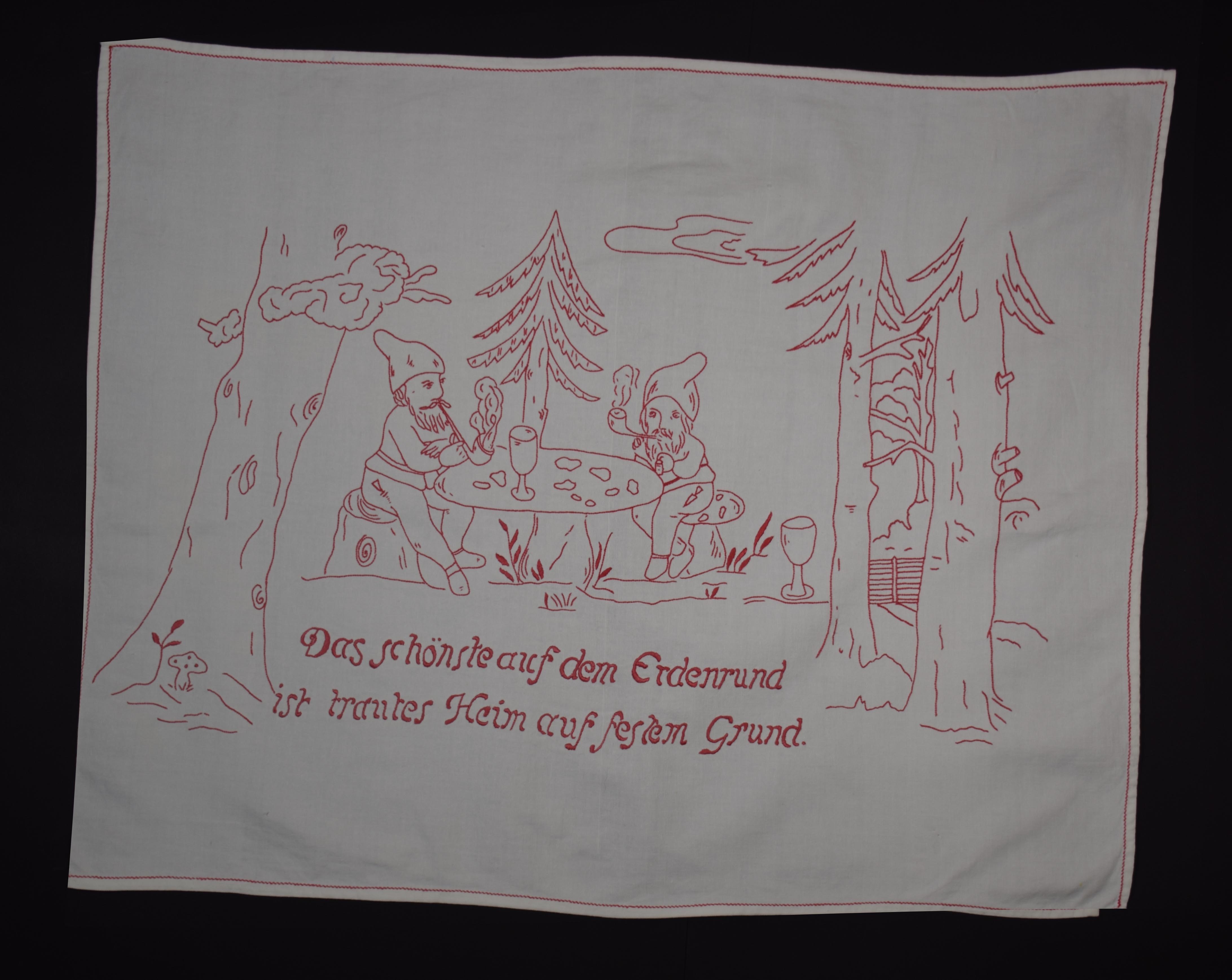 Rot besticktes Spruchtuch. Das Motiv und der Spruch sind mit Stielstich und Plattstich unterlegt gestickt. Dargestellt sind zwei Zwerge, die Pfeife rauchend und trinkend an einem Fliegenpilztisch im Wald sitzen. Unter der Szene steht der Spruch: "Das schönste auf dem Erdenrund / ist trautes Heim auf festem Grund."