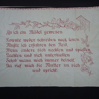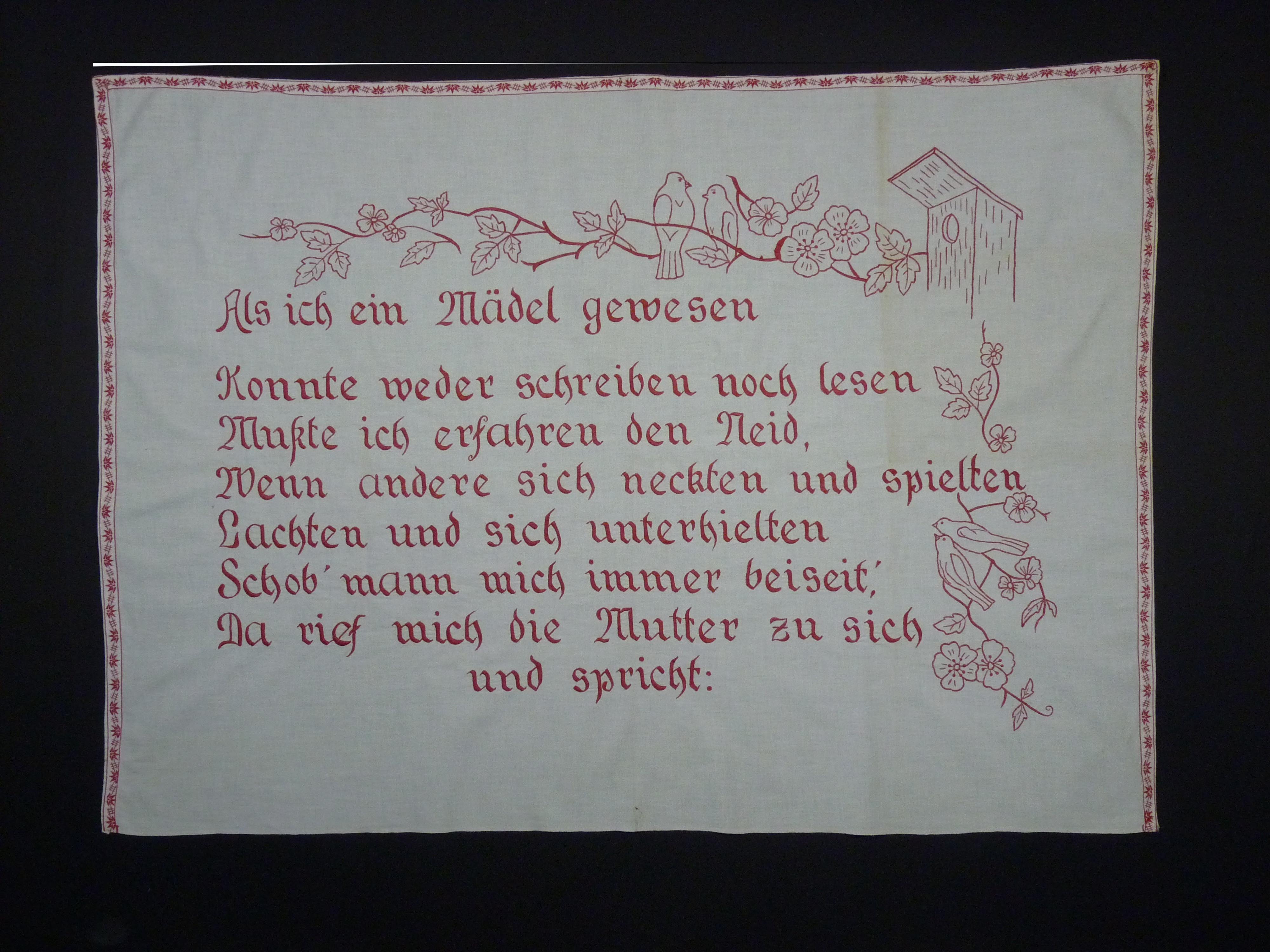 Mit rotem Garn maschinenbesticktes Spruchtuch, das von einem roten Zierband umrandet ist. Dargestellt sind ein Vogelhaus, vier Vögel und blühende Zweige. Diese rahmen den folgenden Spruch, der zweite Teil davon befindet sich auf FM-1804. Der Spruch lautet: "Als ich ein Mädel gewesen / Konnte weder schreiben noch lesen / Mußte ich erfahren den Neid, / Wenn andere sich neckten und spielten / Lachten und sich unterhielten / Schob' mann mich immer beiseit' / Da rief mich die Mutter zu sich / und spricht:"