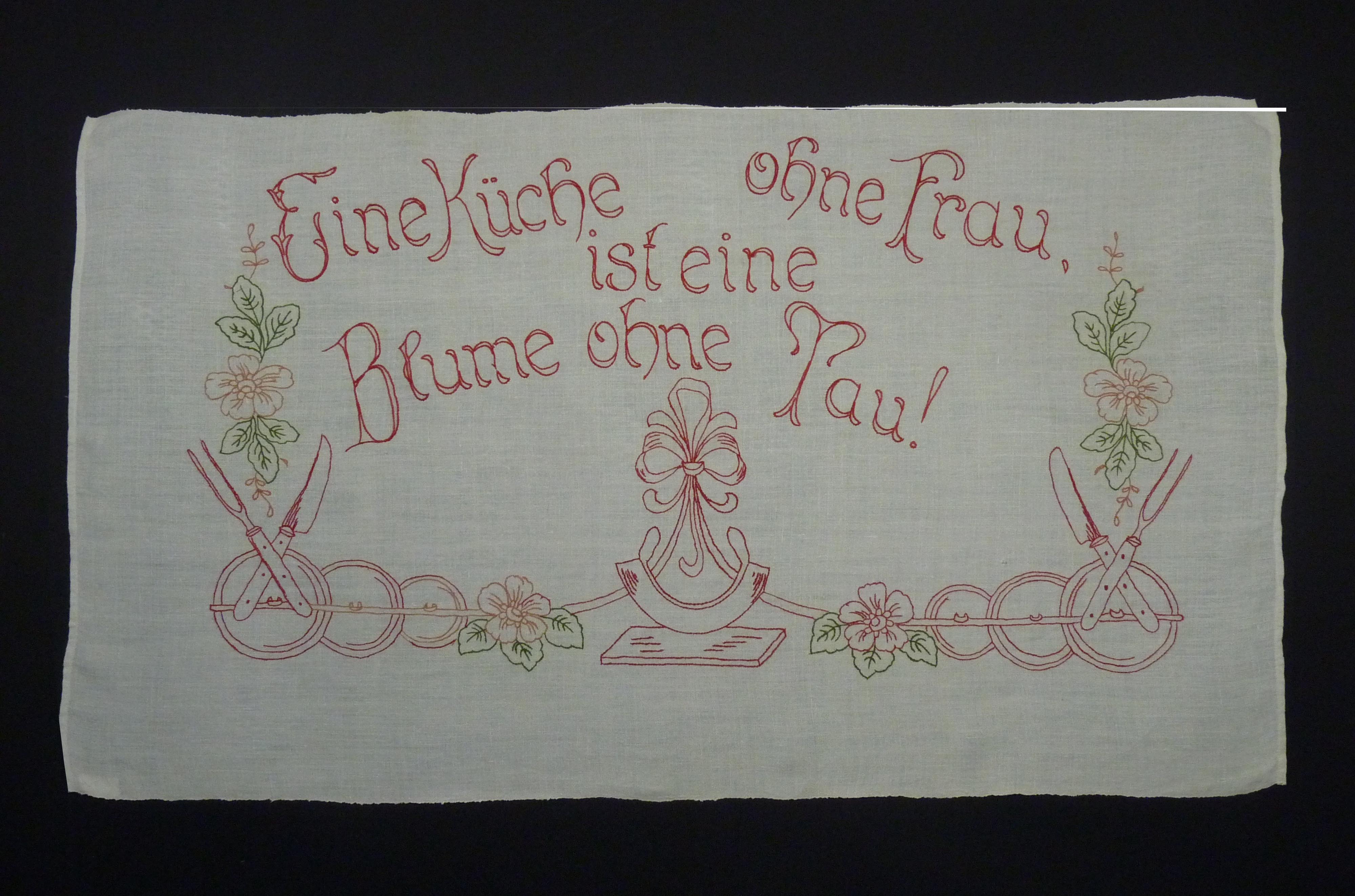 - Mehrfarbig besticktes Spruchtuch. Dargestellt ist mit rotem, grünem und altrosa Faden gestickt, eine Girlande aus Blumen, Tellern und Besteck. Über der Girlande steht der Spruch: "Eine Küche ohne Frau, / ist eine / Blume ohne Tau!"