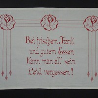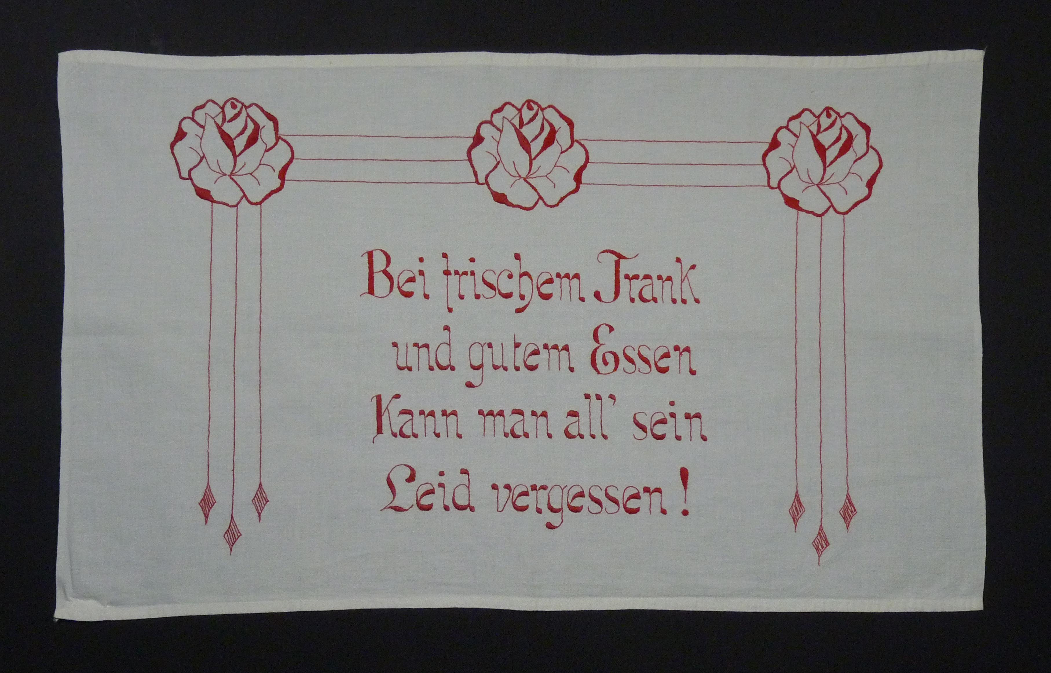 Rot besticktes Spruchtuch. Die Motive sind unter anderem mit Plattstich und Stielstich gestickt. Dargestellt ist ein architektonisch anmutender Rahmen, der aus Linien und Rosen besteht. Unter dem Rahmen findet sich der Spruch: "Bei frischem Trank / und gutem Essen / Kann man all' sein / Leid vergessen!"