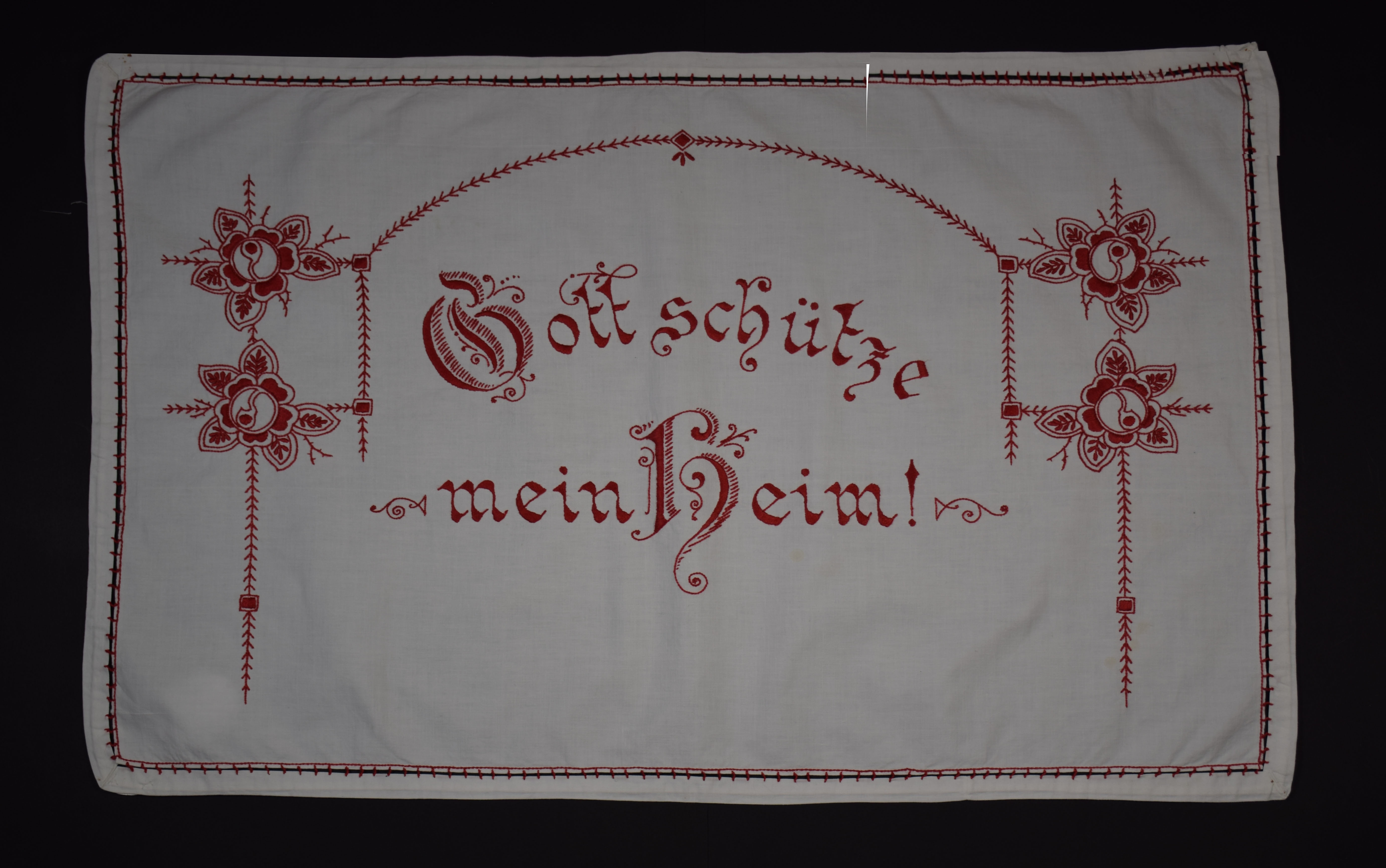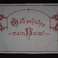 Rot besticktes Spruchtuch, dessen Umrandung aus einem weißen Stoffband besteht, das durch einen Hohlsaum mit dem Tuch verbunden ist. Die Motive sind vor allem mit Plattstich und Stielstich gestickt. Dargestellt sind Blumenornamente, die den folgenden Spruch rahmen: "Gott schütze / mein Heim!"