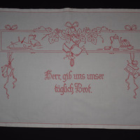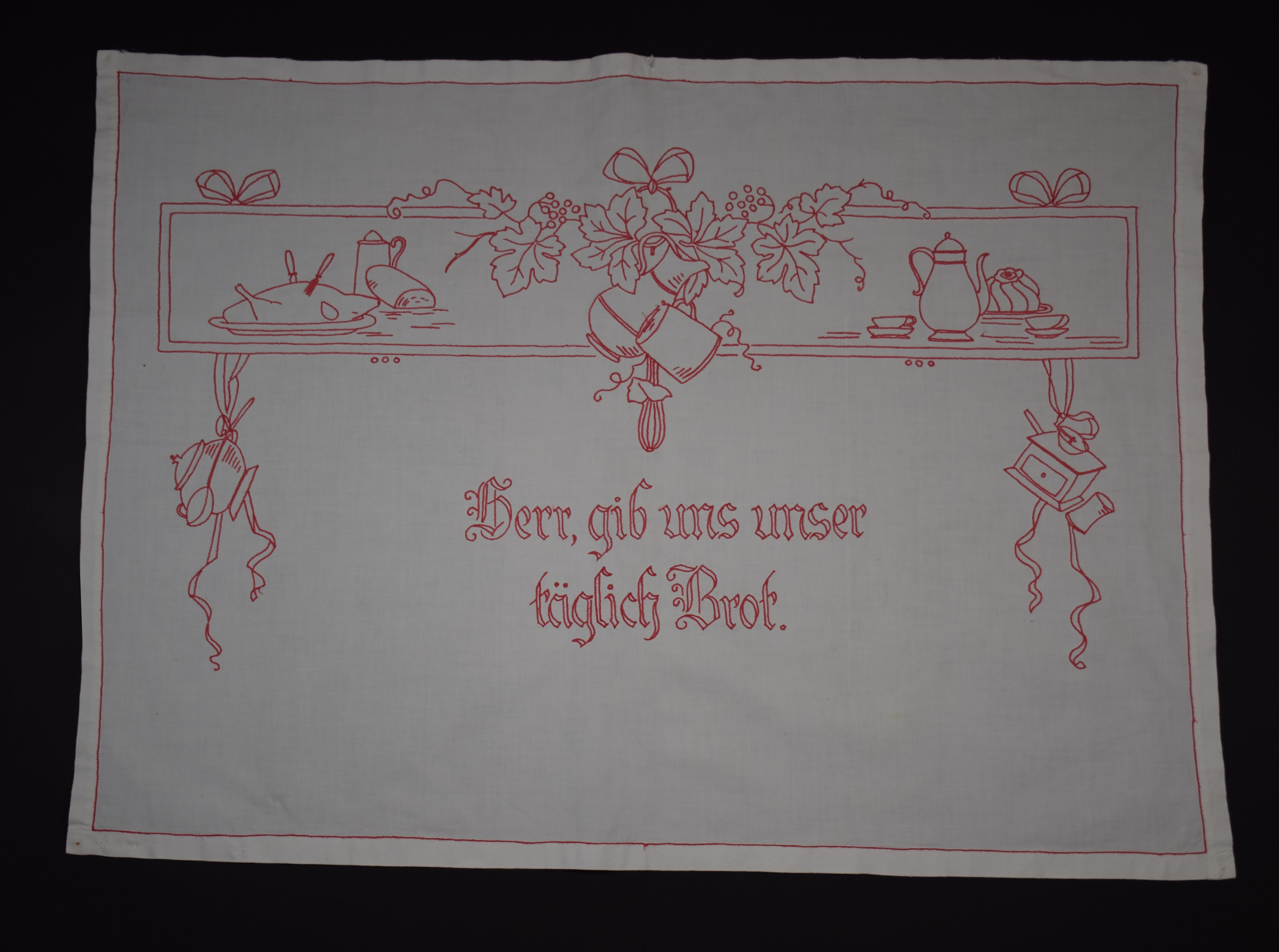 Rot besticktes Spruchtuch, das von einer feinen, roten Linie gerahmt wird. Auf dem Tuch dargestellt sind Weinreben, eine Kaffeemühle, mehrere Teekannen und Essen. Diese Motive rahmen den Spruch: "Herr, gib uns unser / täglich Brot."