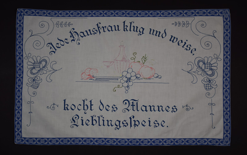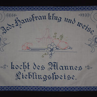 Mehrfarbig besticktes Spruchtuch, das von einem blauen Zierband eingefasst wird. Dargestellt sind ein, mit den Farben Blau, Rot, Lilia, Grün und Gelb gestickter, gedeckter Esstisch und verschiedene Ornamente. Darüber und darunter steht der, mit Blau gestickte Spruch: "Jede Hausfrau klug und weise, / kocht des Mannes / Lieblingsspeise."
