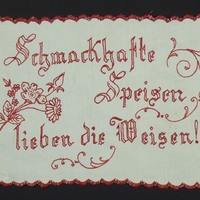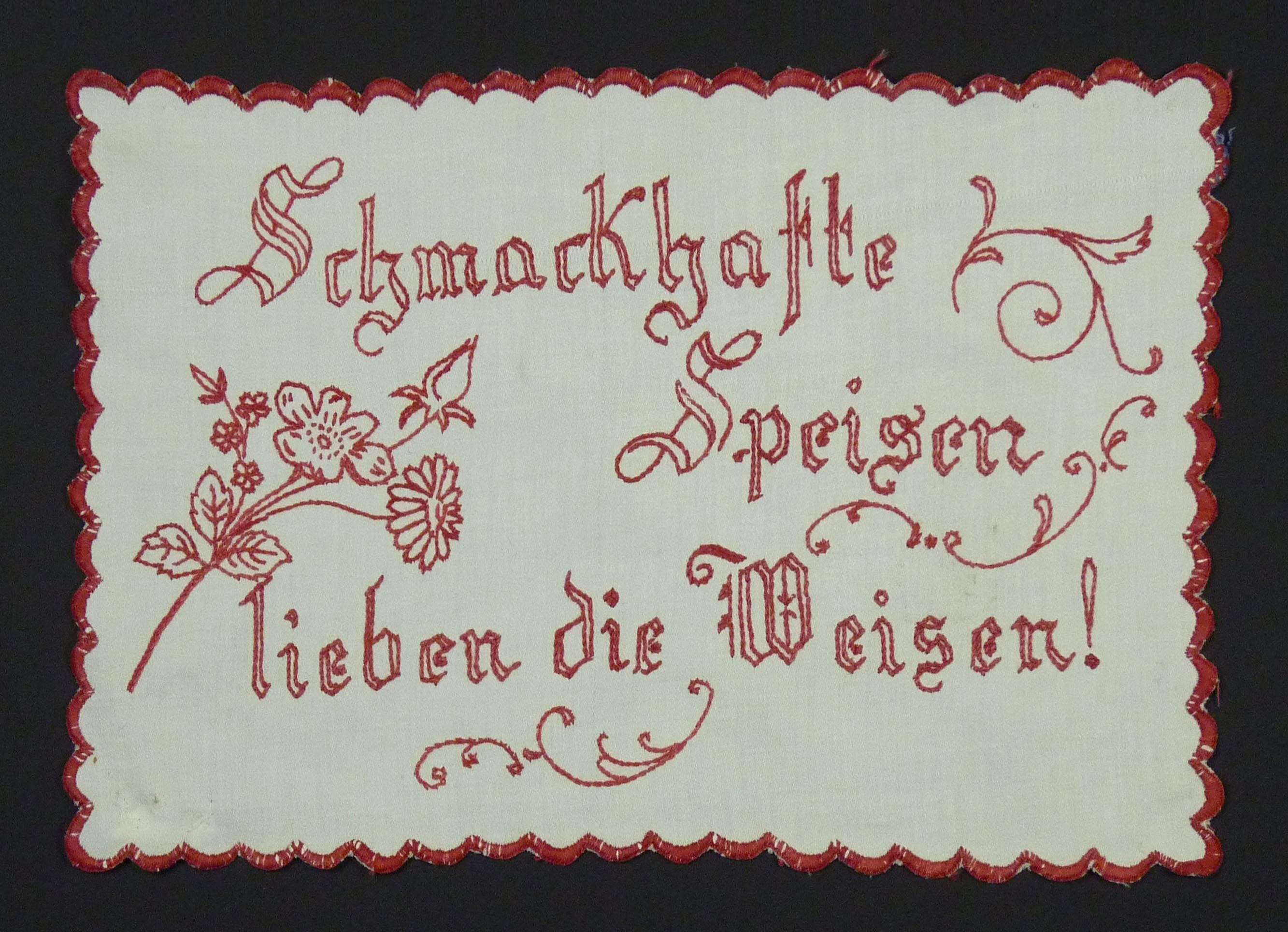 - Rot besticktes Deckchen, das mit Schlingstich eingefasst ist. Dargestellt sind ein Spruch und Blumenornamente, die den Spruch verzieren. Dieser lautet: "Schmackhafte / Speisen / lieben die Weisen".
