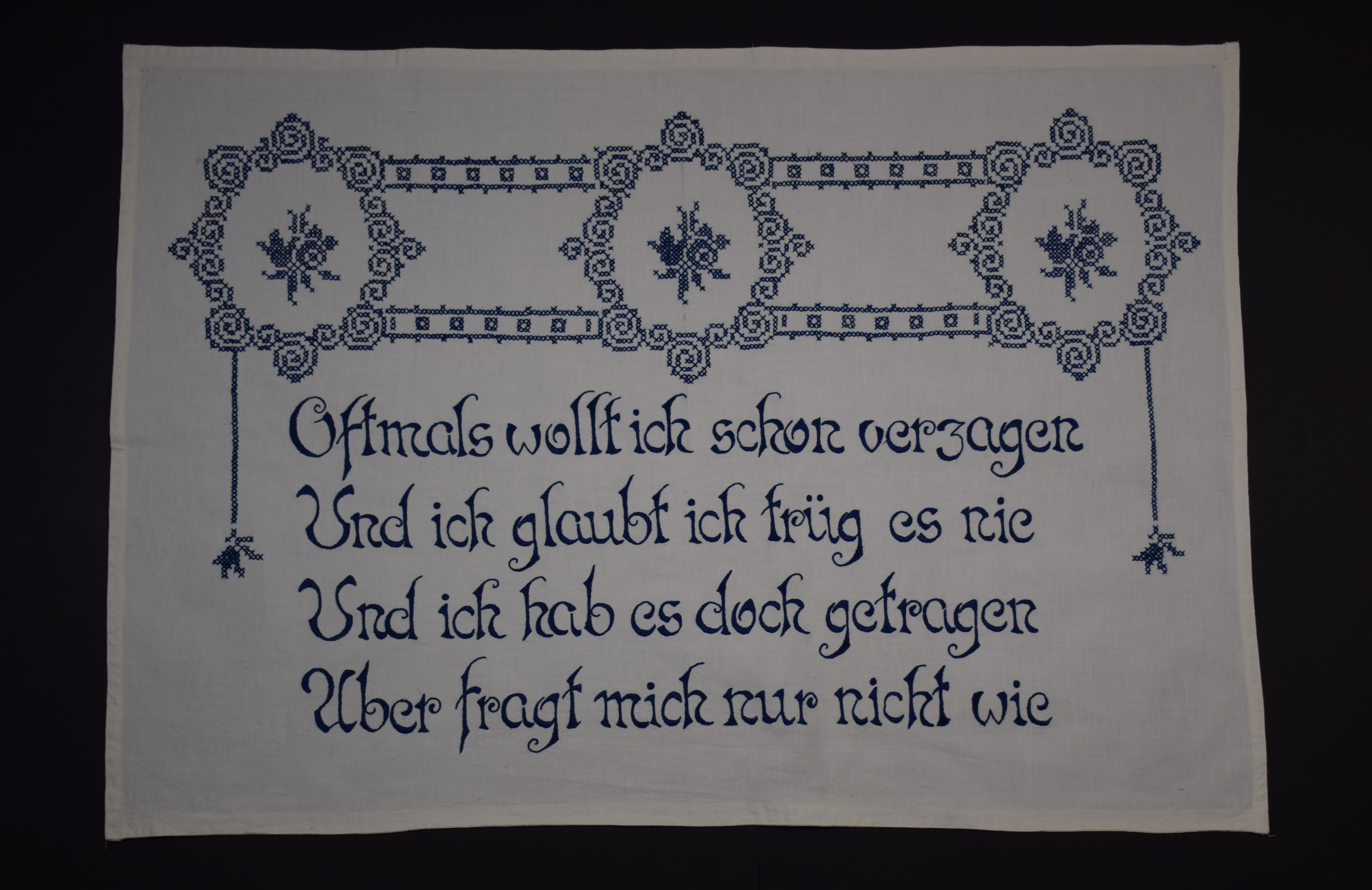 blau bestickter; Kreuzstich und Plattstich; Ornamente;