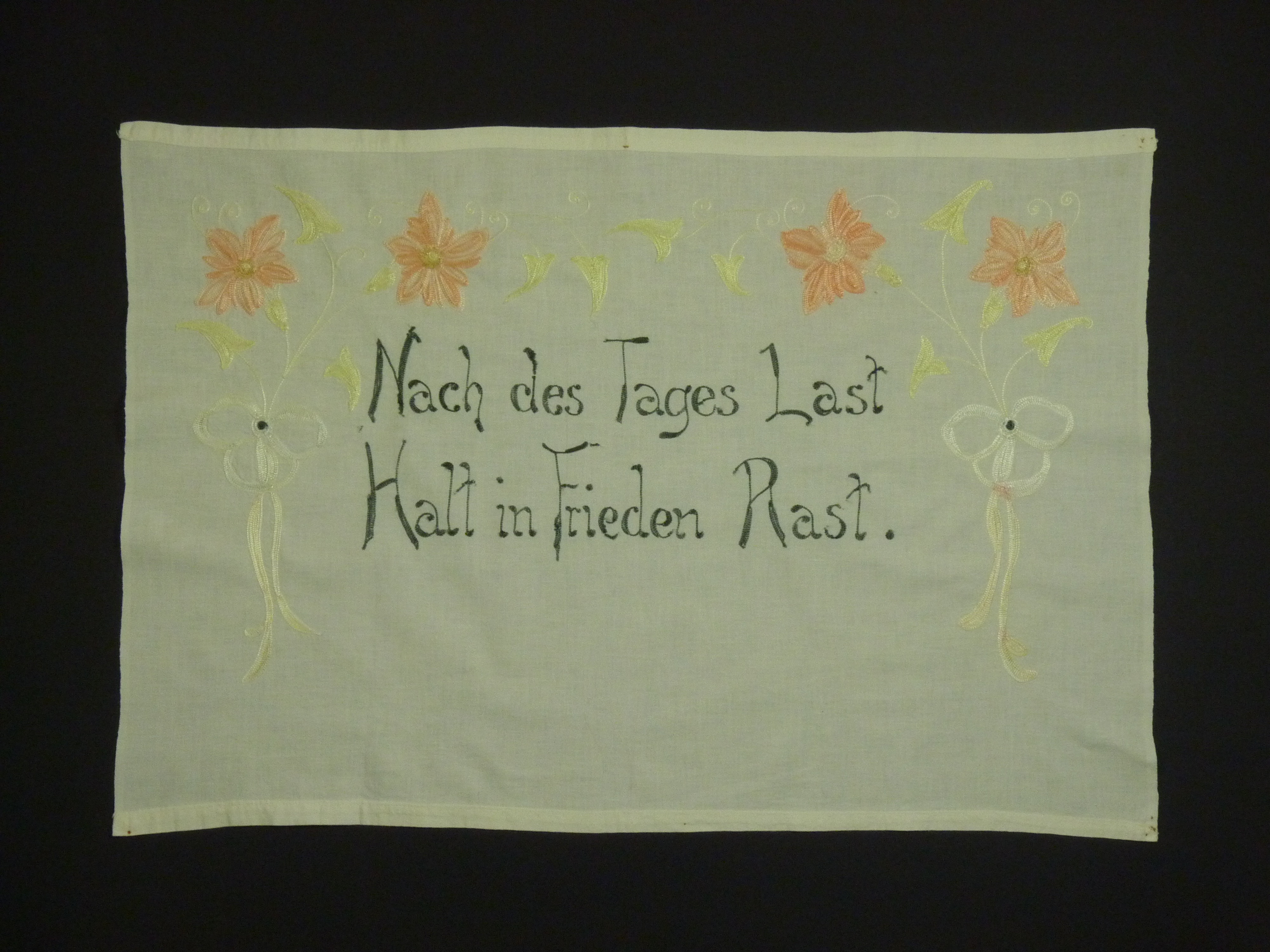 bunt bestickt; Motiv: Blumen; oben und unten eingesäumt; kleine Flecken und Löcher; maschinenbestickt;