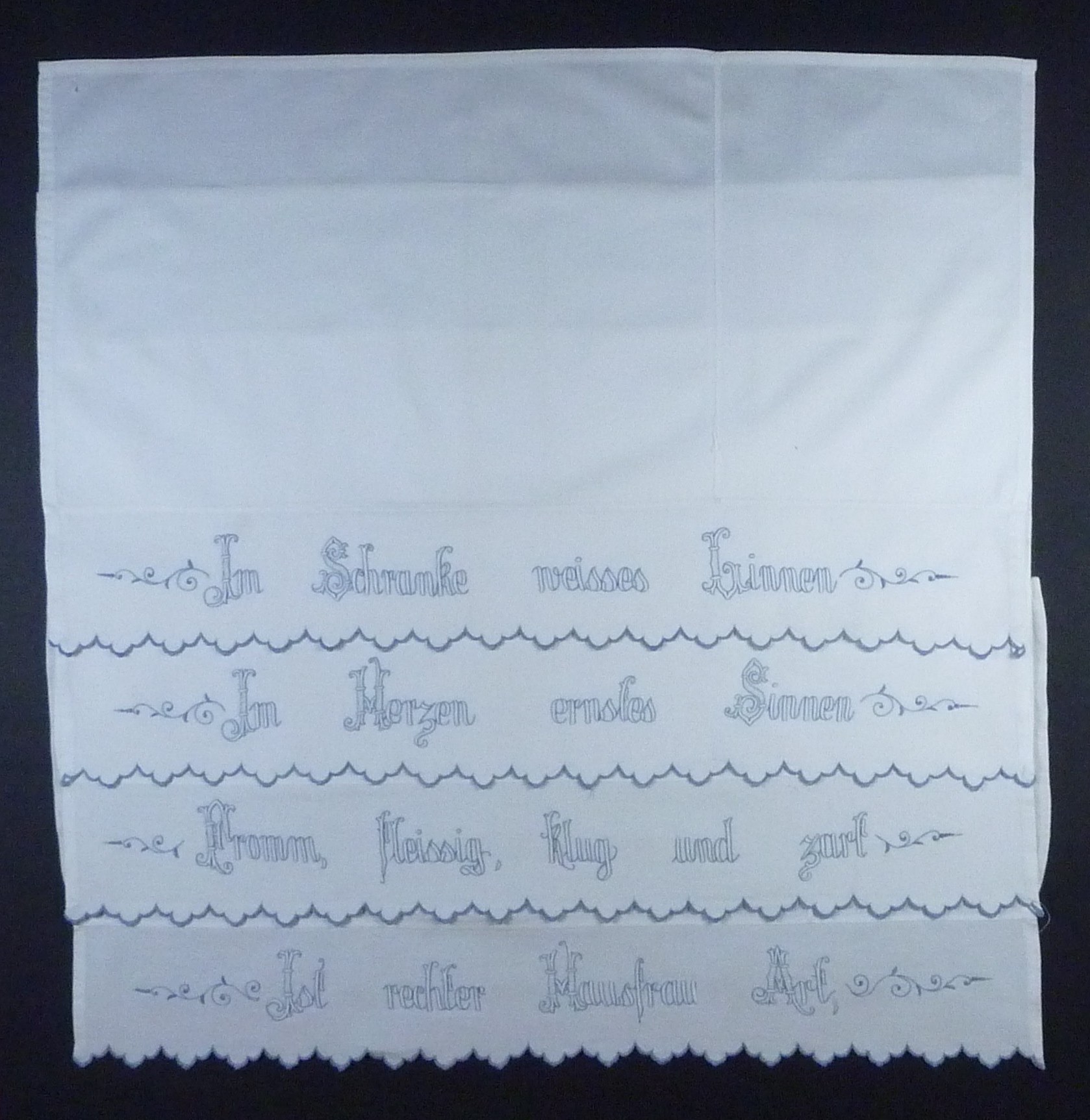 Spruch: "Im Schranke weisses Linnen / Im Herzen ernstes Sinnen / Fromm, fleissig, klug und zart / Ist rechter Hausfrau Art"