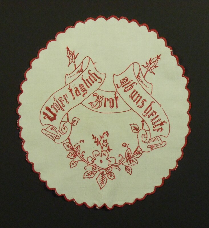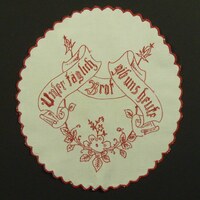 - In Rot bestickt; mit Schlingstich eingefasst; Motiv: Blumengirlande; Spruch in einem Spruchband: "Unser täglich / Brot / gib uns heute"