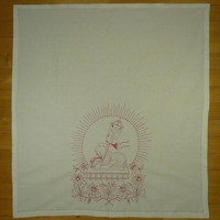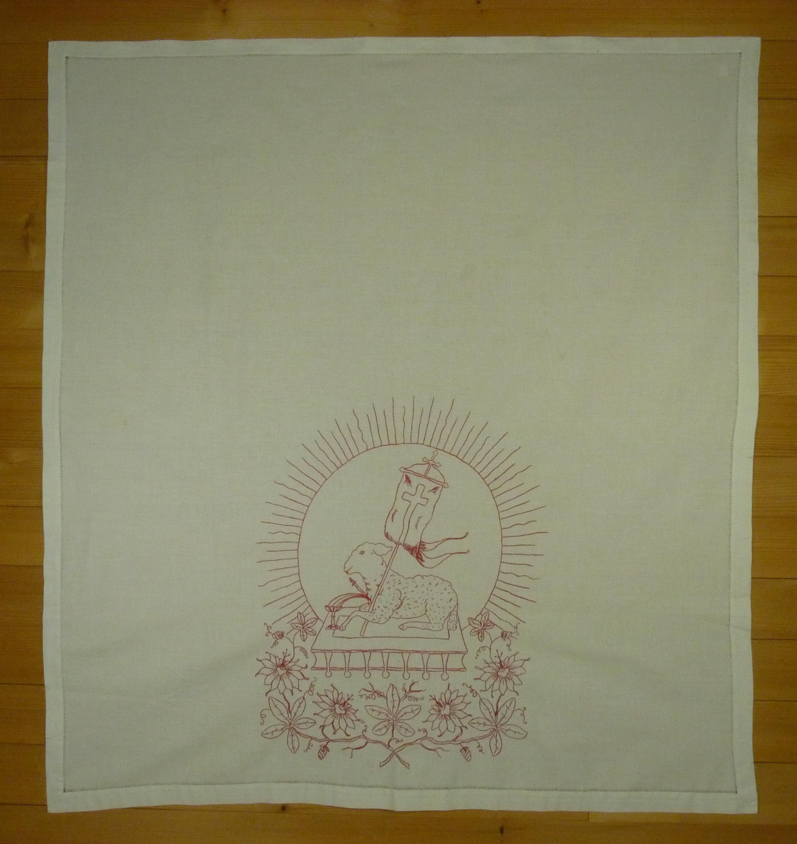 - In Rot bestickt; Stielstich; Hohlsaum an allen 4 Seiten; Motiv: Lamm Gottes trägt Fahne mit Kreuz, liegt auf einem Altar, Strahlenkranz und Blumenranken