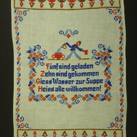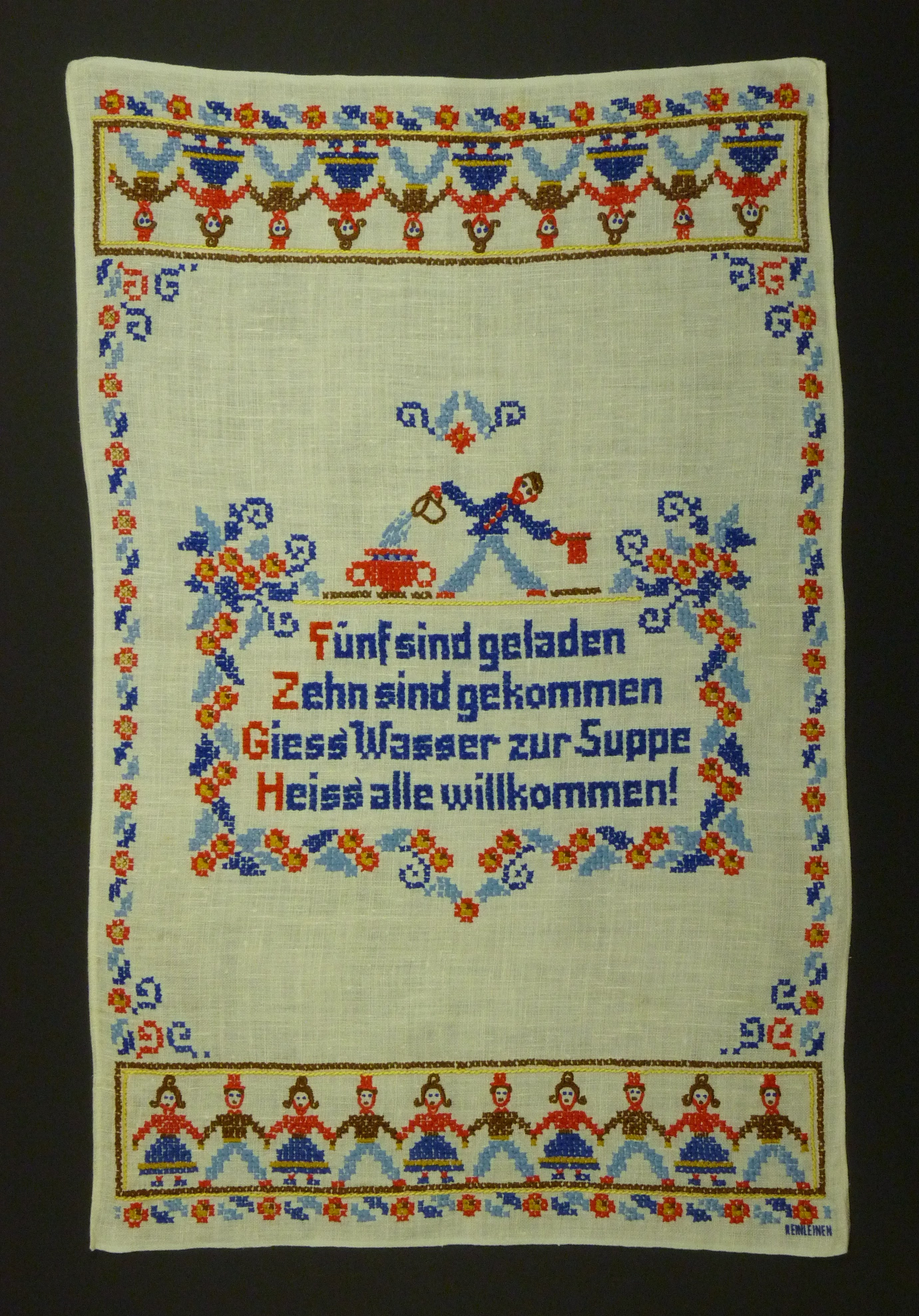 - In dunkel- und hellblau, rot, braun und gelb bestickt; Kreuzstich; Motiv: oben und unten Menschenkette, mittig gießt ein Mann Wasser in die Suppe; Spruch: "Fünf sind geladen / Zehn sind gekommen / Giess Wasser zur Suppe / Heiss alle willkommen!"