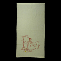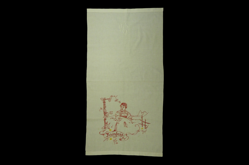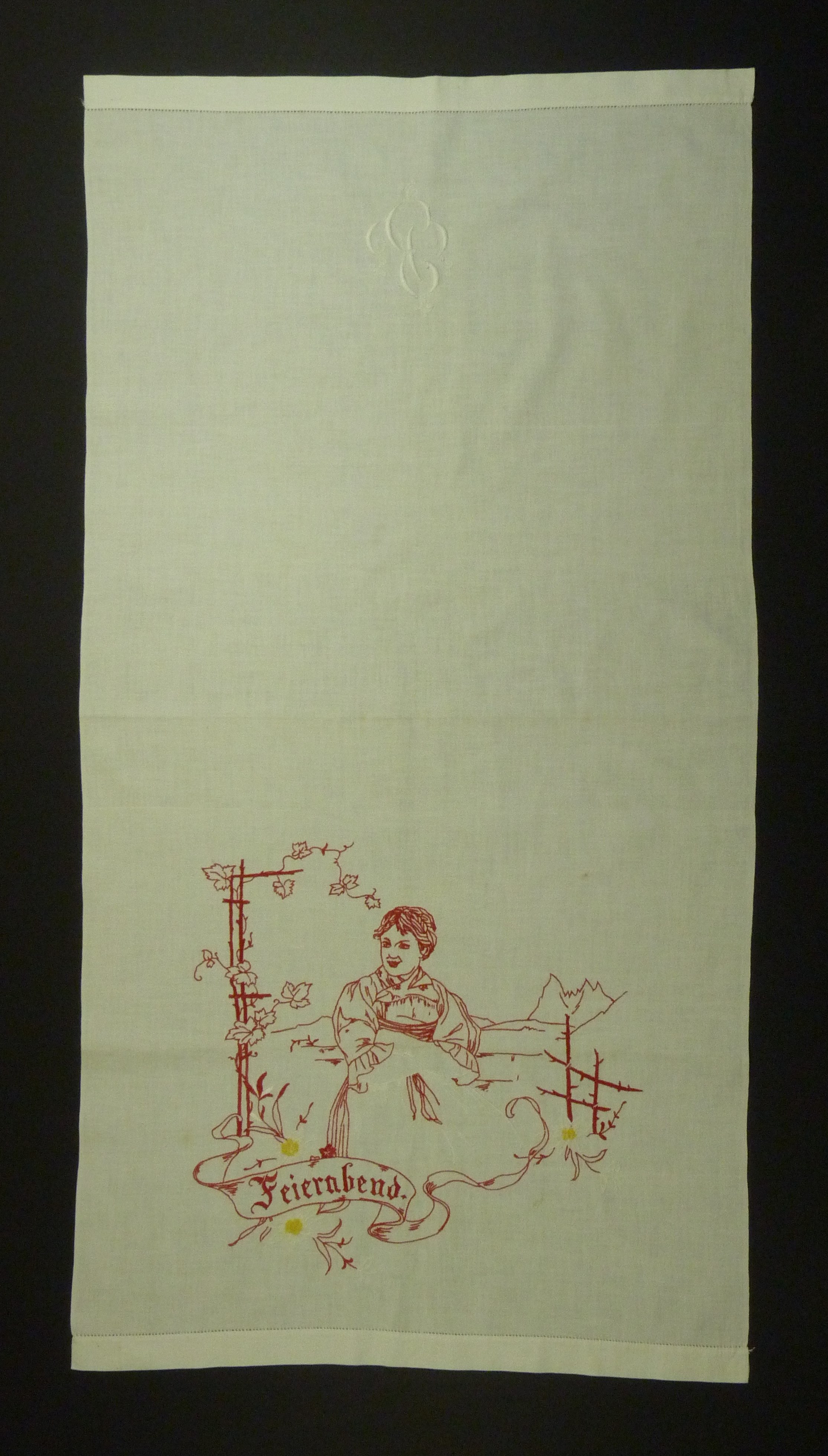- Motiv: junge Frau in Tracht, Hände verschränkt, Edelweiß und Weinreben; rot, weiß, gelb bestickt; Stielstich, Plattstich, Knötchenstich; Monogramm in weiß; Plattstich unterlegt, oben und unten feiner Hohlsaum; Spruch: "Feierabend."