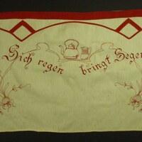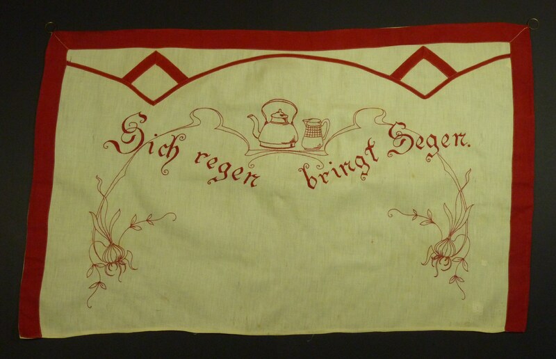 - Motiv: Teekanne, Milchhafen, zwei Zwiebeln mit Zierranken; Platt- und Stielstich; rot bestickt; rechts, links und oben mit breitem, rotem Textilband eingefasst; obere Ecken mit Metallring; Spruch: "Sich regen bringt Segen."