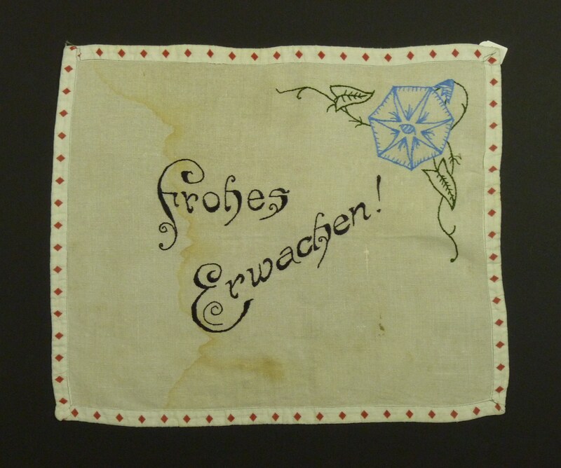 - Schwarz, Blau und Grün bestickt; Plattstich; Blumenmotiv; eingefasst mit weiß-rotem Textilband; Spruch: "Frohes / Erwachen!"