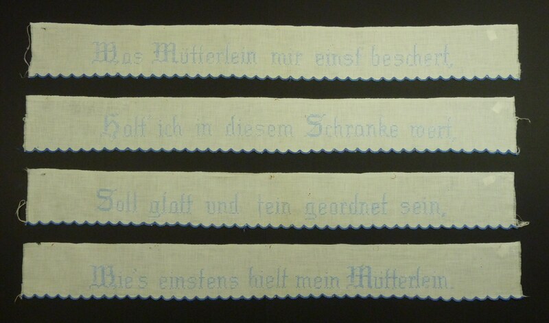 - Blau bestickt; Kreuzstich; unterer Rand mit Schlingstich eingefasst; Spruch: "Was Mütterlein mir einst beschert, / Halt' ich in diesem Schranke wert, / Soll glatt und fein geordnet sein, / Wie's einstens hielt mein Mütterlein."