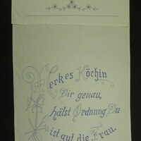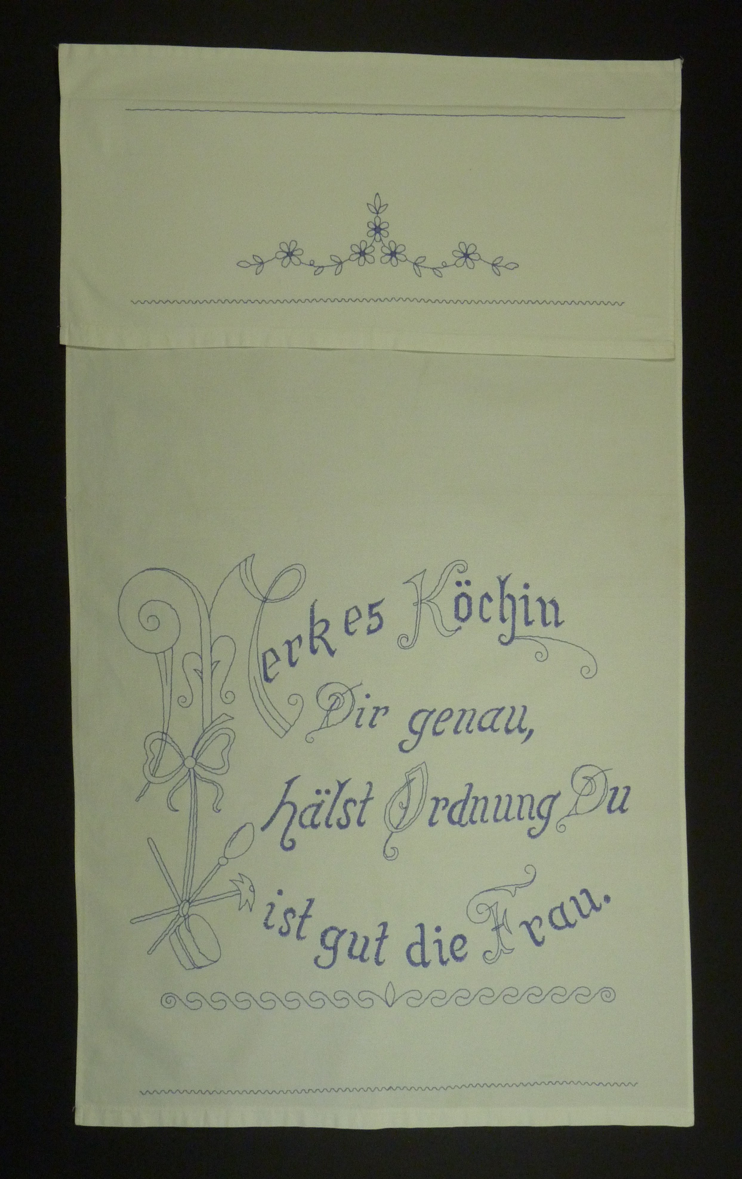 - Blau bestickt; Plattstich, Steppstich; Motiv: Schleife mit Küchenutensilien, in der oberen Hälfte doppelt, mit Blumengirlande; Spruch: "Merk es Köchin / Dir genau, / hälst Ordnung Du / ist gut die Frau. /