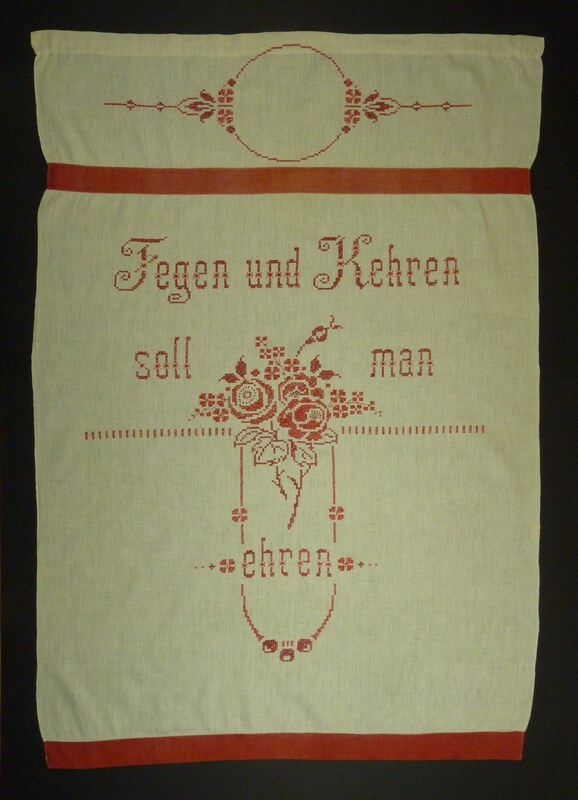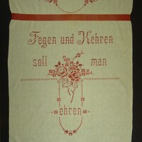 - Gestickt mit zwei verschiedenen Rottönen; Kreuzstich; mit Rosenmotiv und Verzierungen; unterer Rand mit rotem Band eingefasst, im oberen Drittel rotes Band aufgenäht; Spruch: "Fegen und Kehren / soll man / ehren"