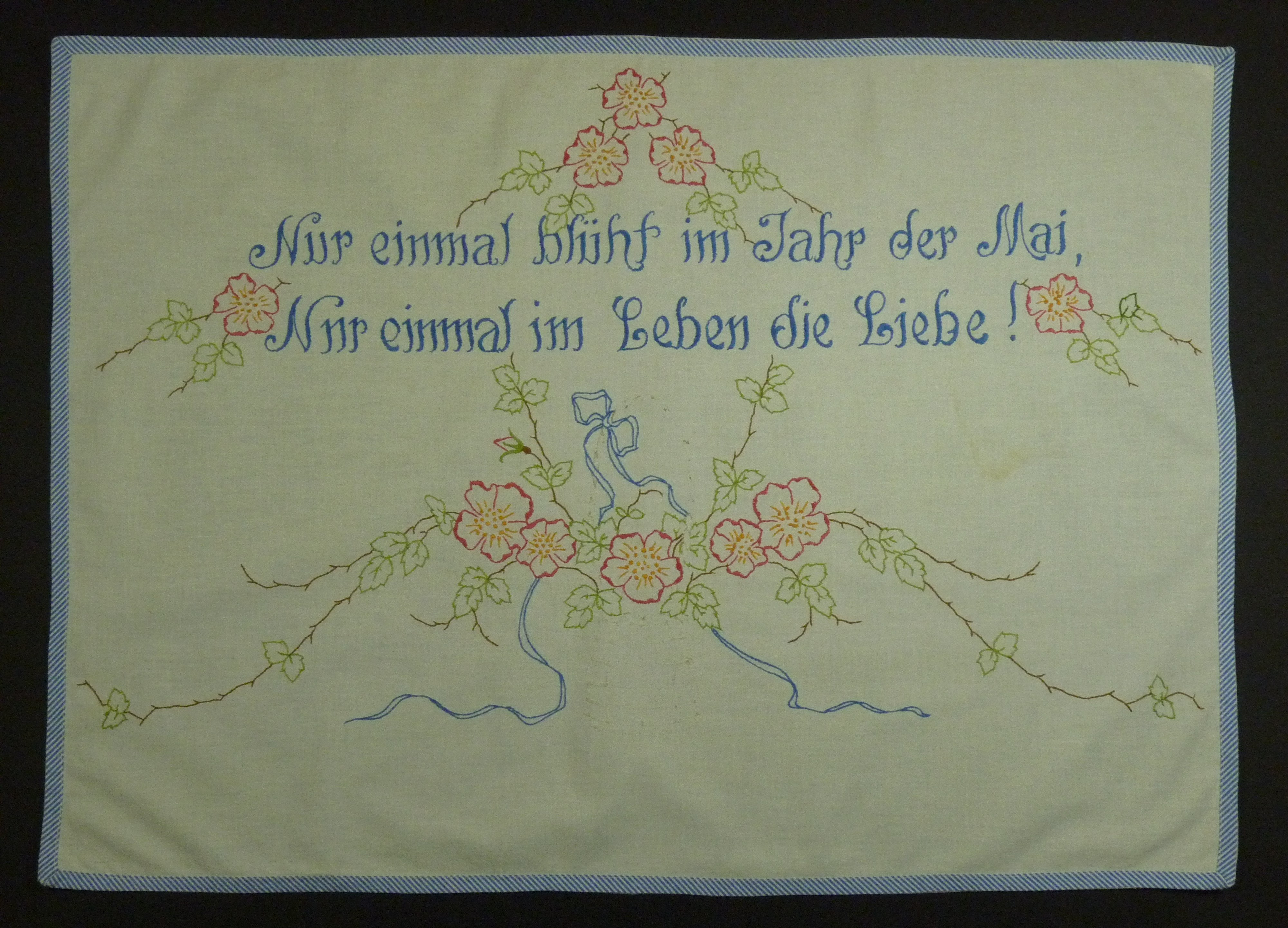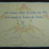 - Spruch mit blauem Faden gestickt; Blumenmuster in Grün, Blau, Rot; Spruch: "Nur einmal blüht im Jahr der Mai, / Nnr einmal im Leben die Liebe!"