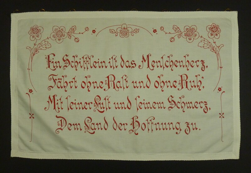 - Mit rotem Faden bestickt; mit Zierband eingefasst; Ringe zum Aufhängen; Blumenranken; Spruch: "Ein Schifflein ist das Menschenherz, / Fährt ohne Rast und ohne Ruh’, / Mit seiner Lust und seinem Schmerz, / Dem Land der Hoffnung zu. /"
