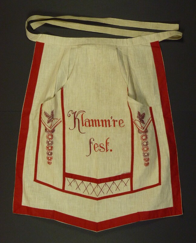 - In zwei verschiedenen Rottönen bestickt; Plattstich unterlegt, Vorstich, Stielstich; mit rotem Band eingefasst; links und rechts mit Blumenbodüre; Spruch: "Klamm're / fest."
