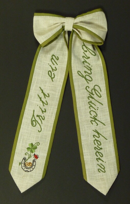 - In Grün, Rot, Blau, Gelb bestickt; Kettenstich, Stielstich; mit grünem Band eingefasst; Motiv: Maikäfer, Hufeisen, Klee; Spruch: "Tritt ein / bring Glück herein"