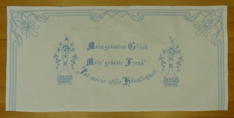 - Blau bestickt; Plattstich, Stielstich; gehäkelte Laschen zum Aufhängen; Ornamente, Blumenvasen; Spruch: "Mein grösstes Glück / Mein' grösste Freud' / Ist meine stille Häuslichkeit!"