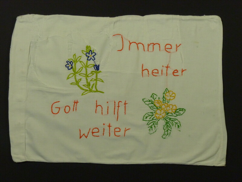 - In Gelb, Grün, Blau, Rot bestickt in Stielstich; ohne Vordruck; Öffnung links verschließbar mit 4 Knöpfen; Blumenmotiv; Spruch: "Immer / heiter / Gott hilft / weiter"