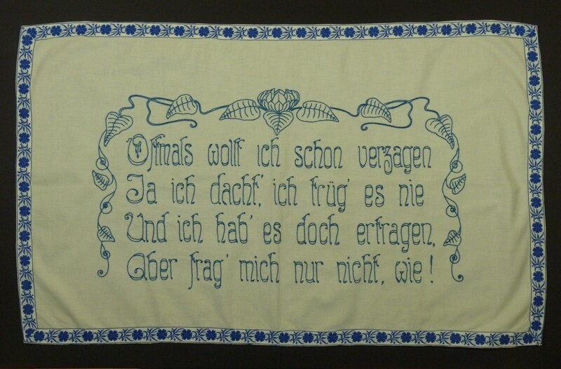 - Blau bestickt; Stielstich; mit blau-weißem Zierband eingefasst; Bättergirlande; Spruch: "Oftmals wollt ich schon verzagen / Ja ich dacht', ich trüg' es nie / Und ich hab' es doch ertragen, / Aber frag' mich nur nicht wie!"