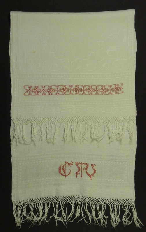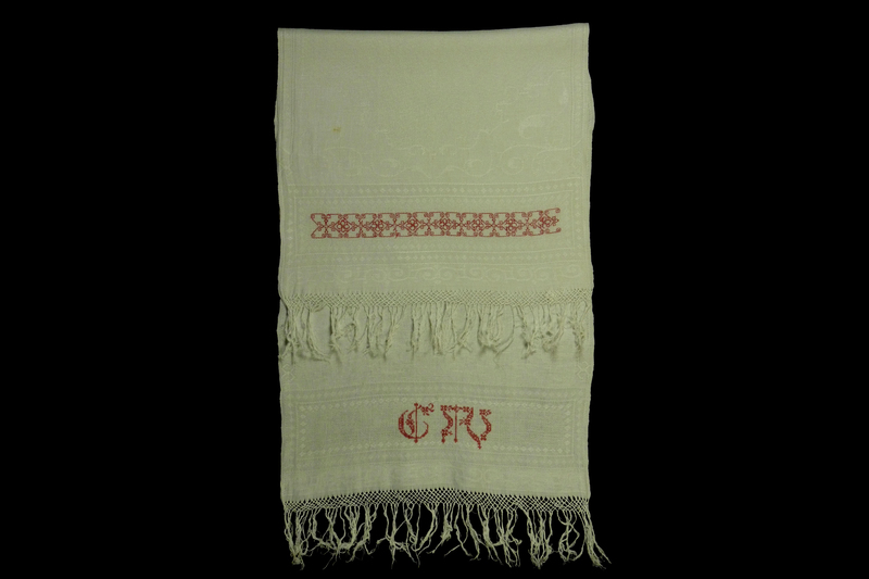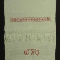 - rot besticktes Überhandtuch mit Fransen; Kreuzstich; mit Musterleiste und Initialen, gemusterter Stoff