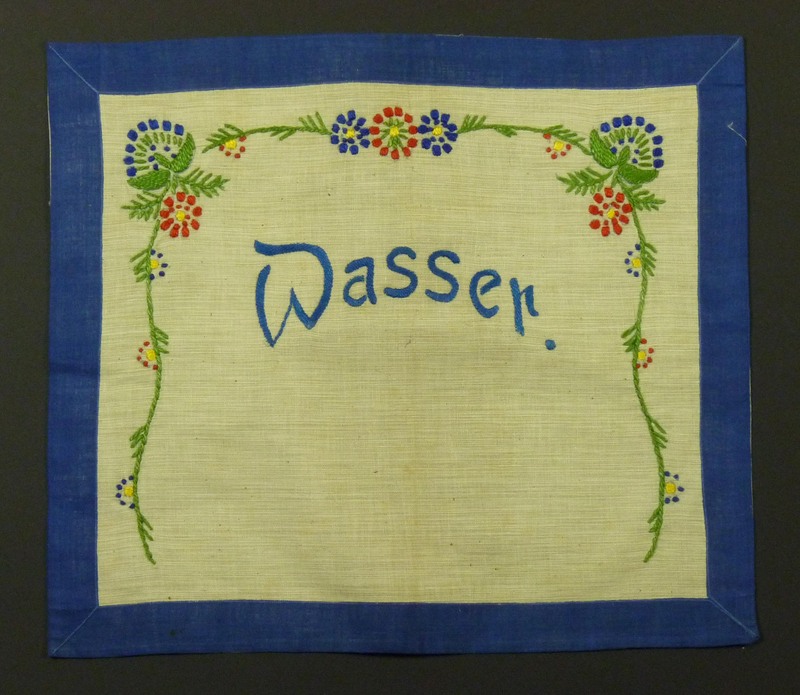 mit Blumengirlande; blau, gelb, rot, grün bestickt; Plattstich, Stielstich, Knötchenstich, Vorstich; mit blauem Band eingefasst;