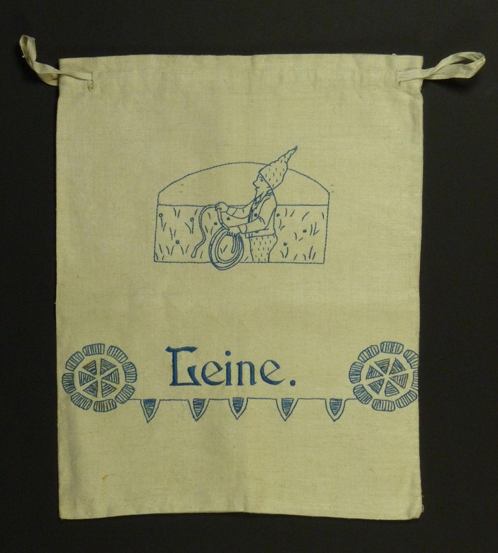 Beutel oder Sack aus Leinen oben zum Zuziehen; um eine Leine aufzubewahren; Motiv: Zwerg mit Seil; Verzierung unten; blau bestickt; Stielstich, Plattstich;