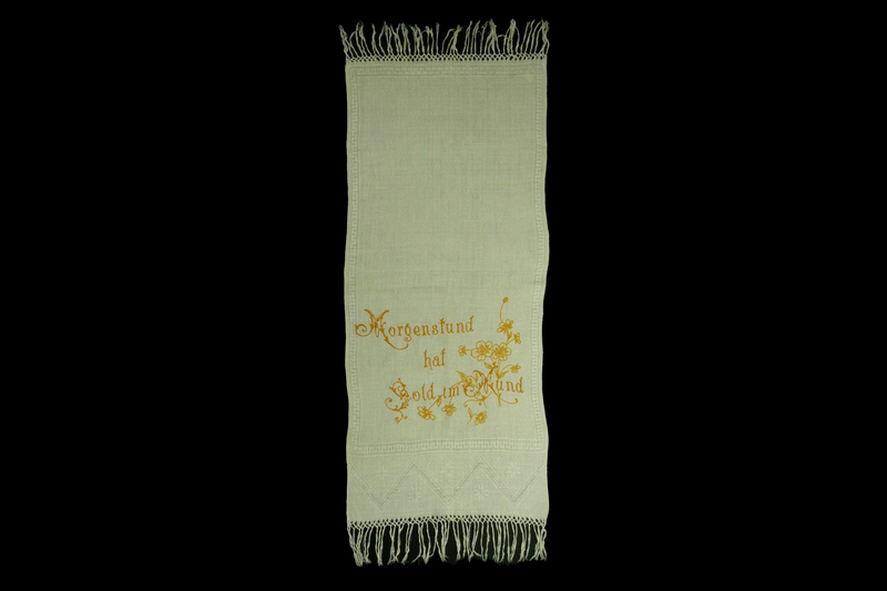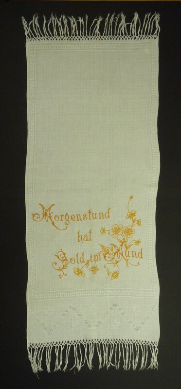 gelb bestickt; eine Art Hohlsaum mit Fransen;