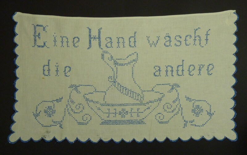 Kreuzstich; blau bestickt; recht, links und unten mit Schlingstich eingefasst; Motiv: Waschschüssel mit Krug;