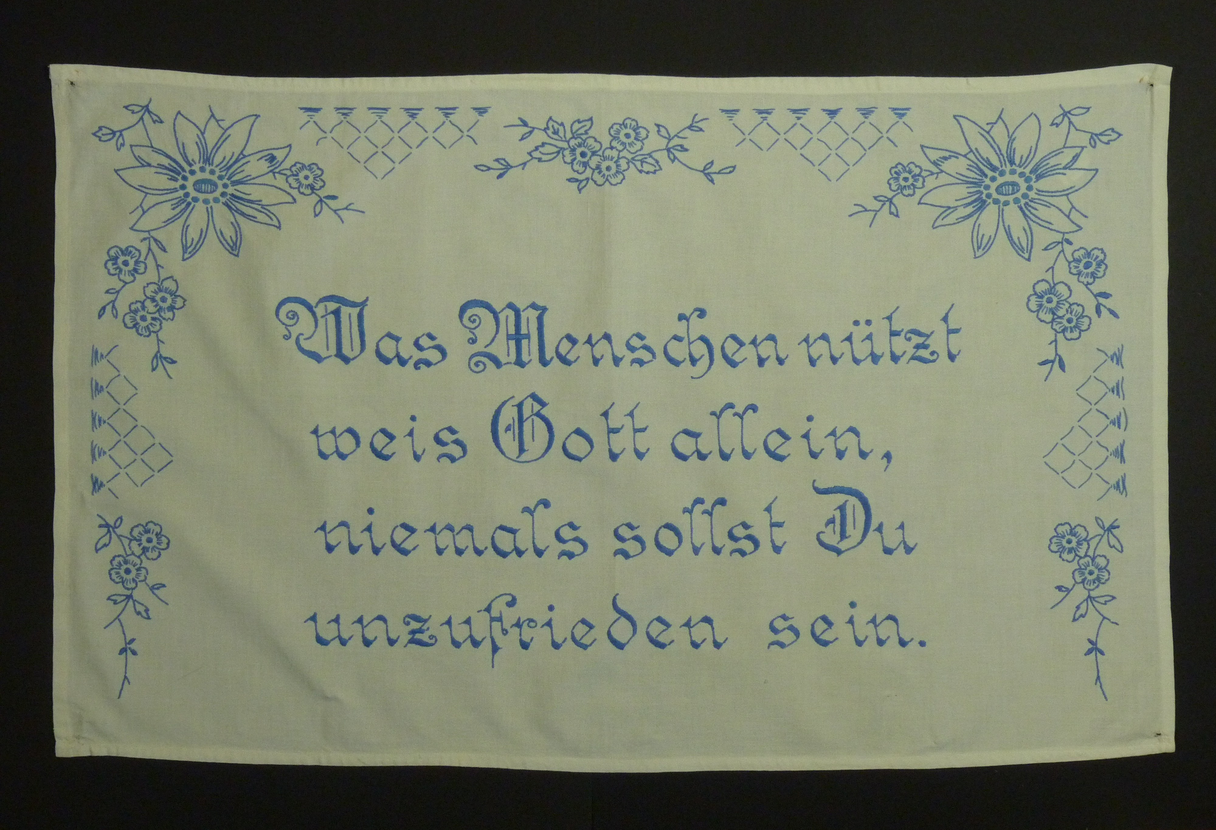 blau bestickt; Plattstich; in den Ecken Löcher von den Befestigungen; Motiv: Blumen;