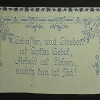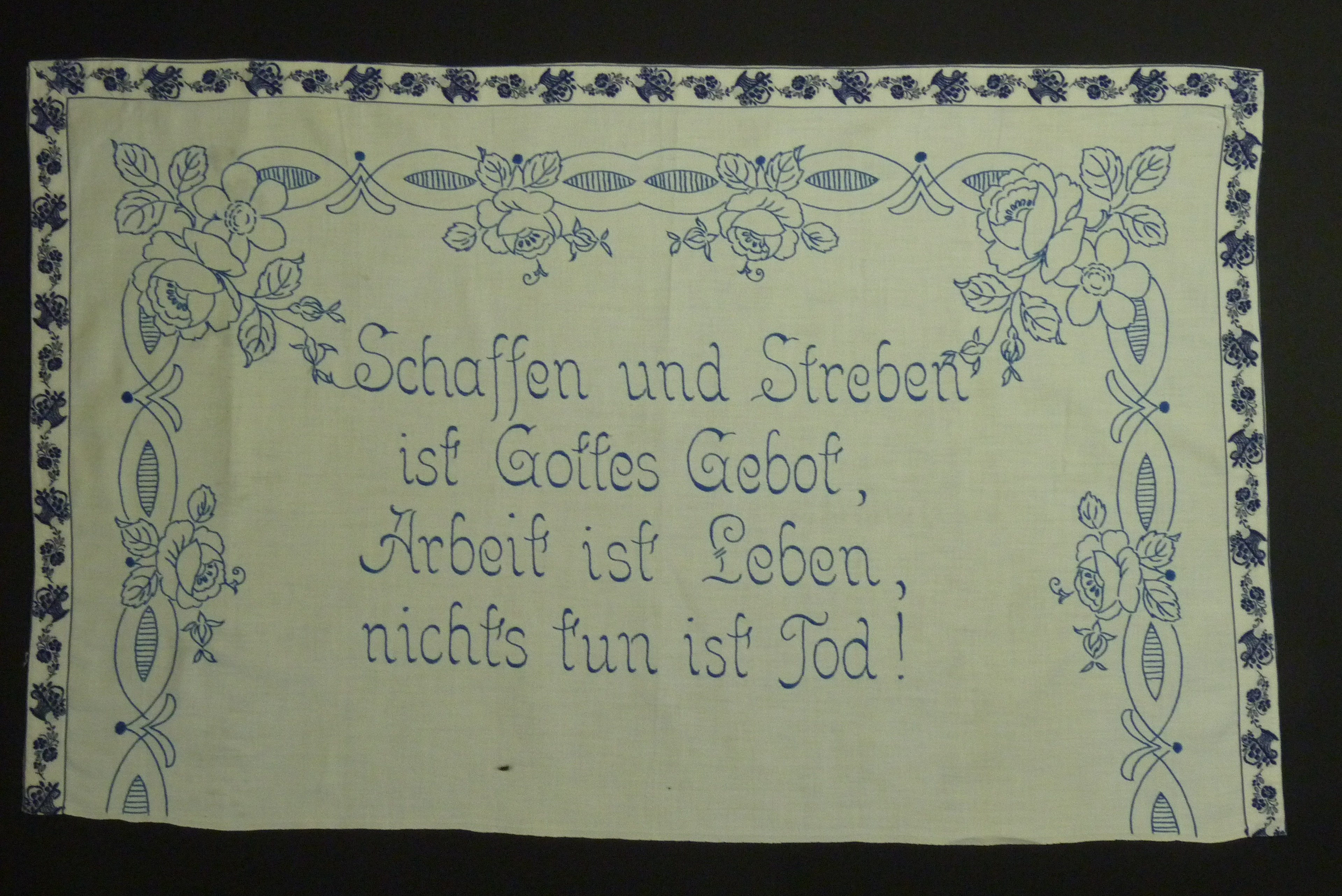 Spruch: "Schaffen und Streben / ist Gottes Gebot, / Arbeit ist Leben, / nichts tun ist Tod!" - Umfang