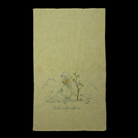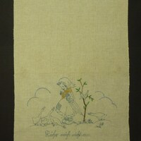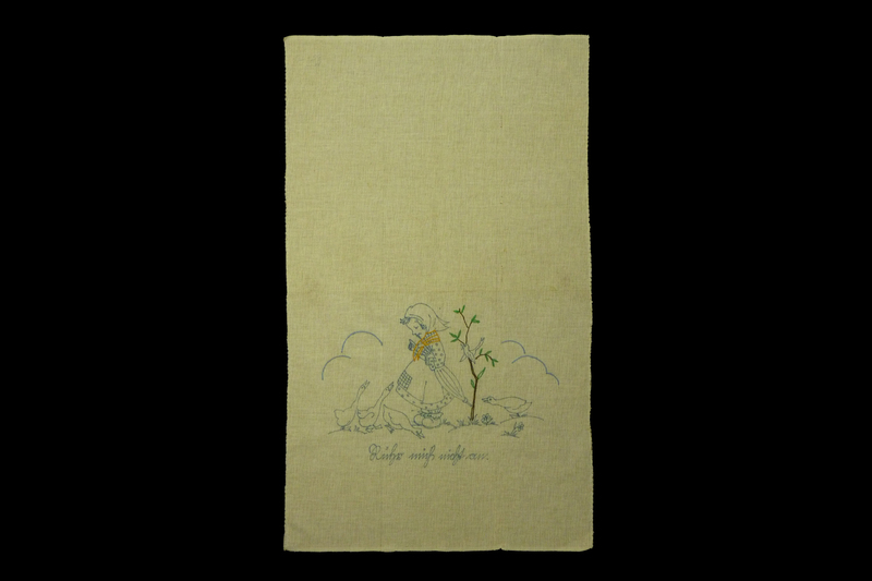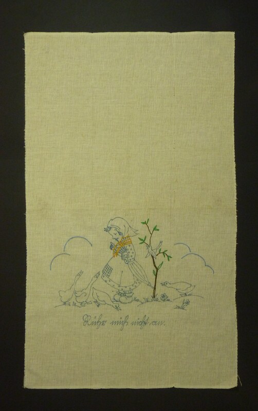 der Kissenbezug ist nicht fertiggestellt, bisher nur Stoffbahn mit begonnener Stickerei; Motiv: Mädchen mit Gänsen