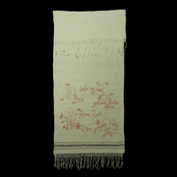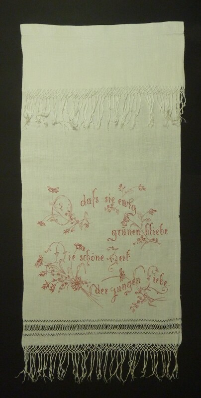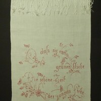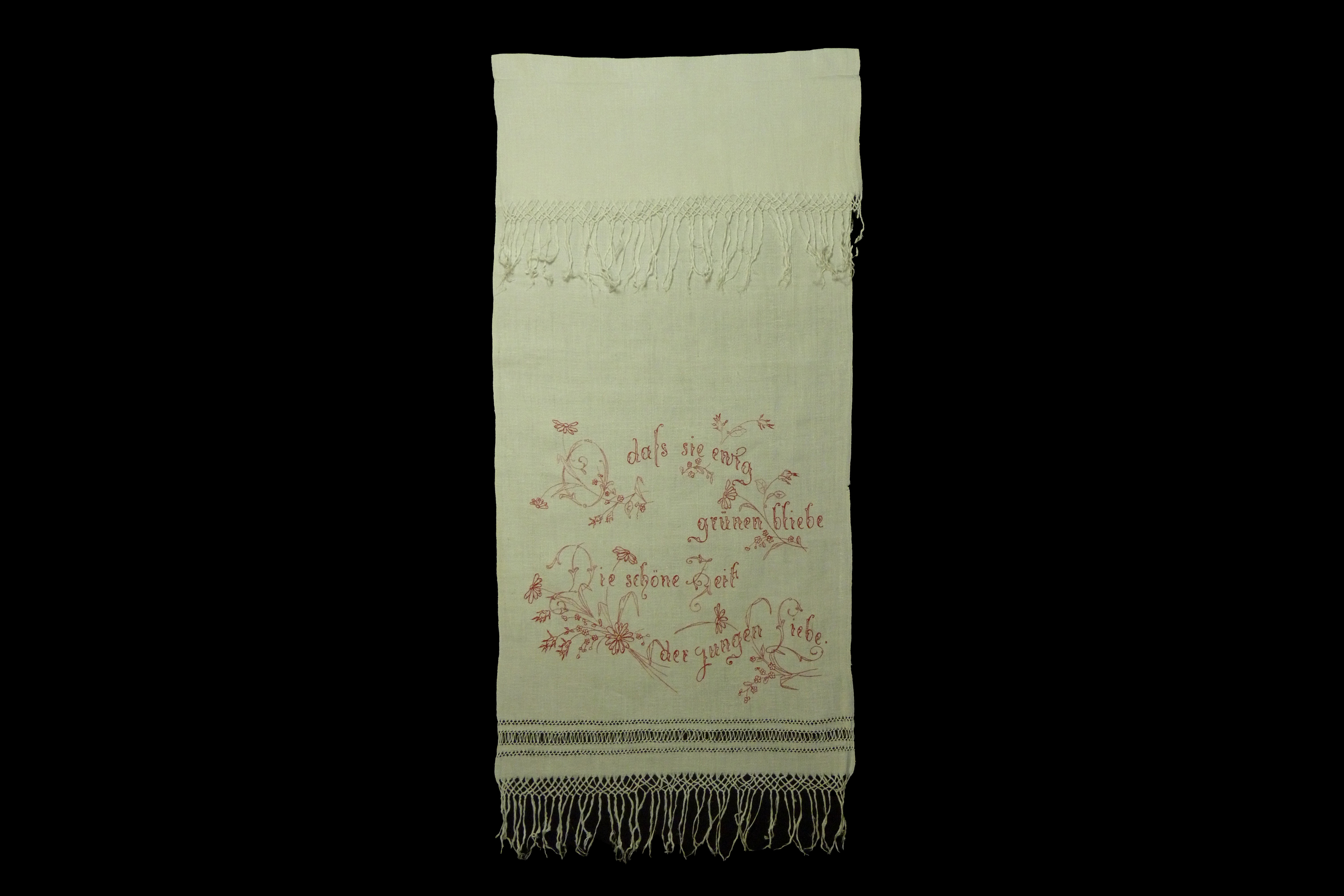 rot bestickt; Großbuchstaben und Teile der Blumenornamente in rosa; mit Fransen; Hohlsaum;