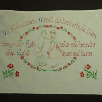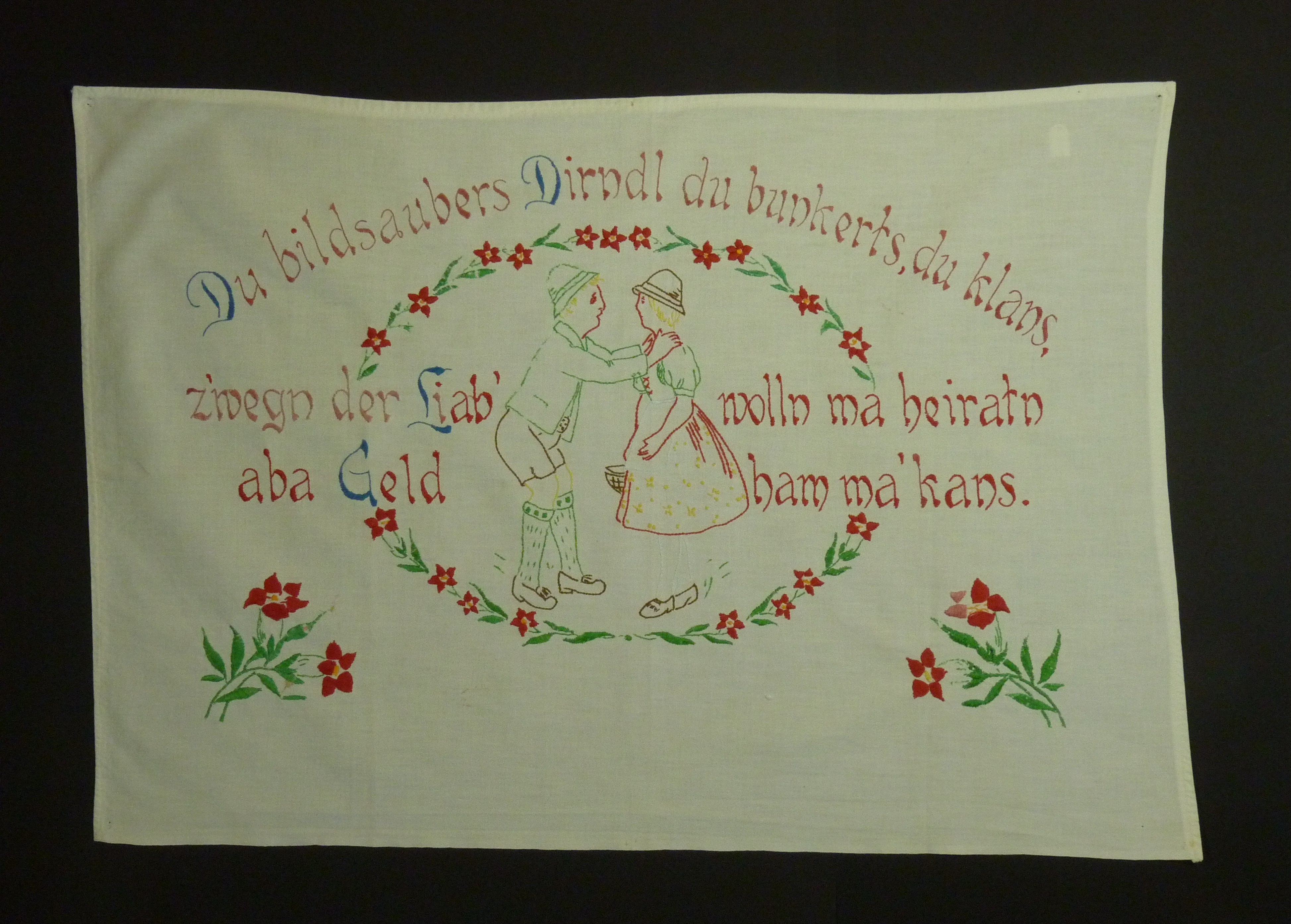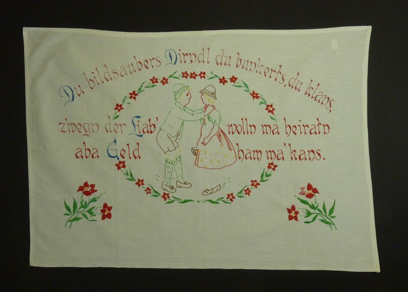 Mädchen im Dirndl, Jungbauer in Lederhosen, umrandet mit Blumenmotiv; rosa, rot, blau, grün und braun bestickt; z.T. abgenutzt, Stickereien lösen sich auf und Stockflecken;