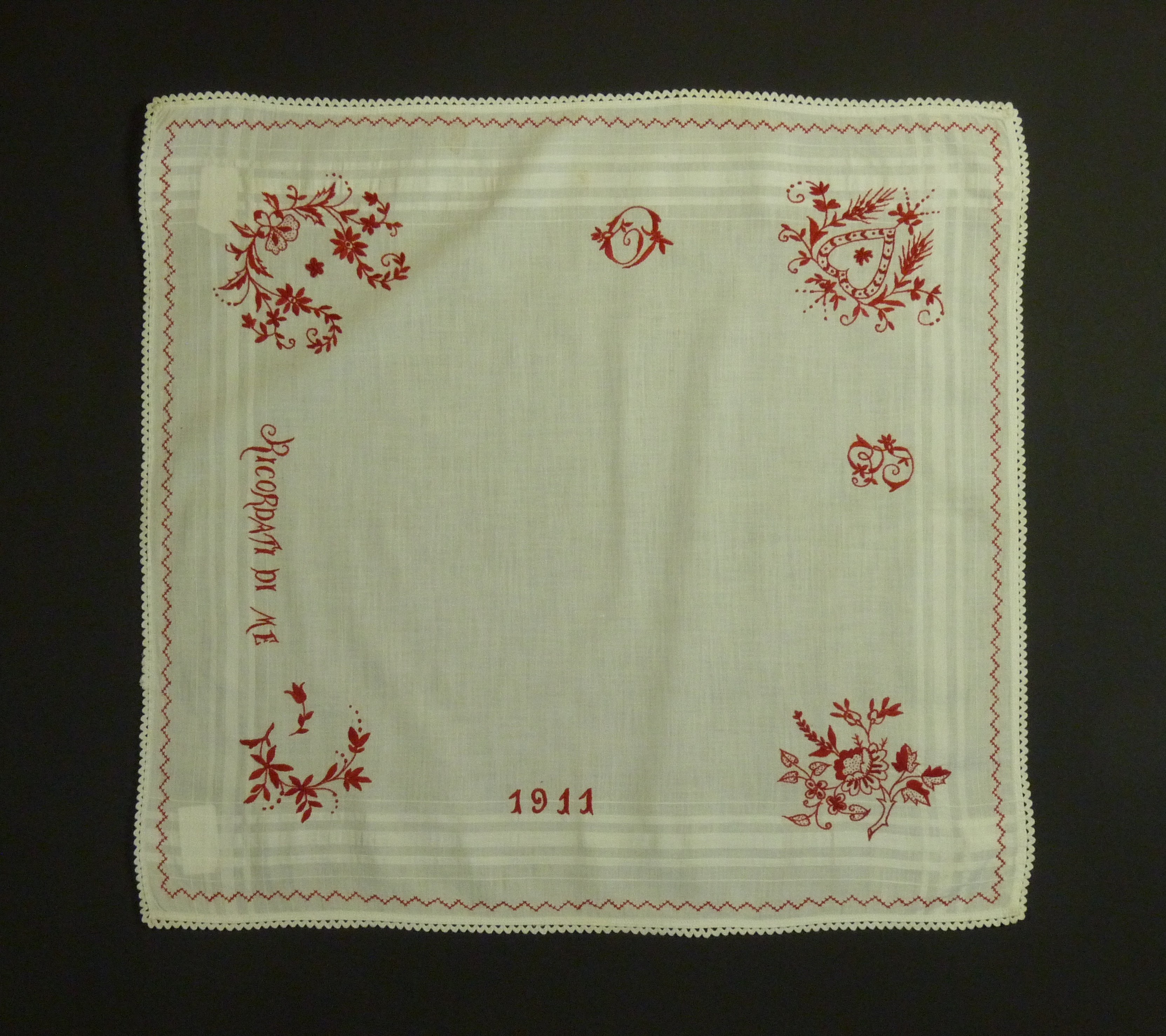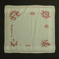 Zierdeckchen aus Baumwolle (Taschentuch) eingefasst mit maschinengewebtem Zierband; Rote Kreuz- und Plattstichstickerei; Blumenranken in den Ecken;