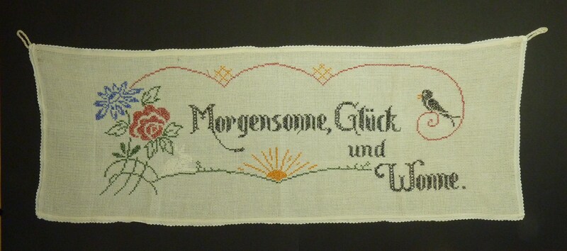 Aida Stoff; schwarz, gelb, grün, blau, rot bestickt; aufgehende Sonne, Blumenbouquet, Vogel, Hase (weiß gestickt); Kreuzstich; zum Aufhängen zwei Schlaufen gehäkelt;