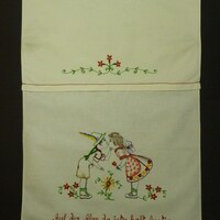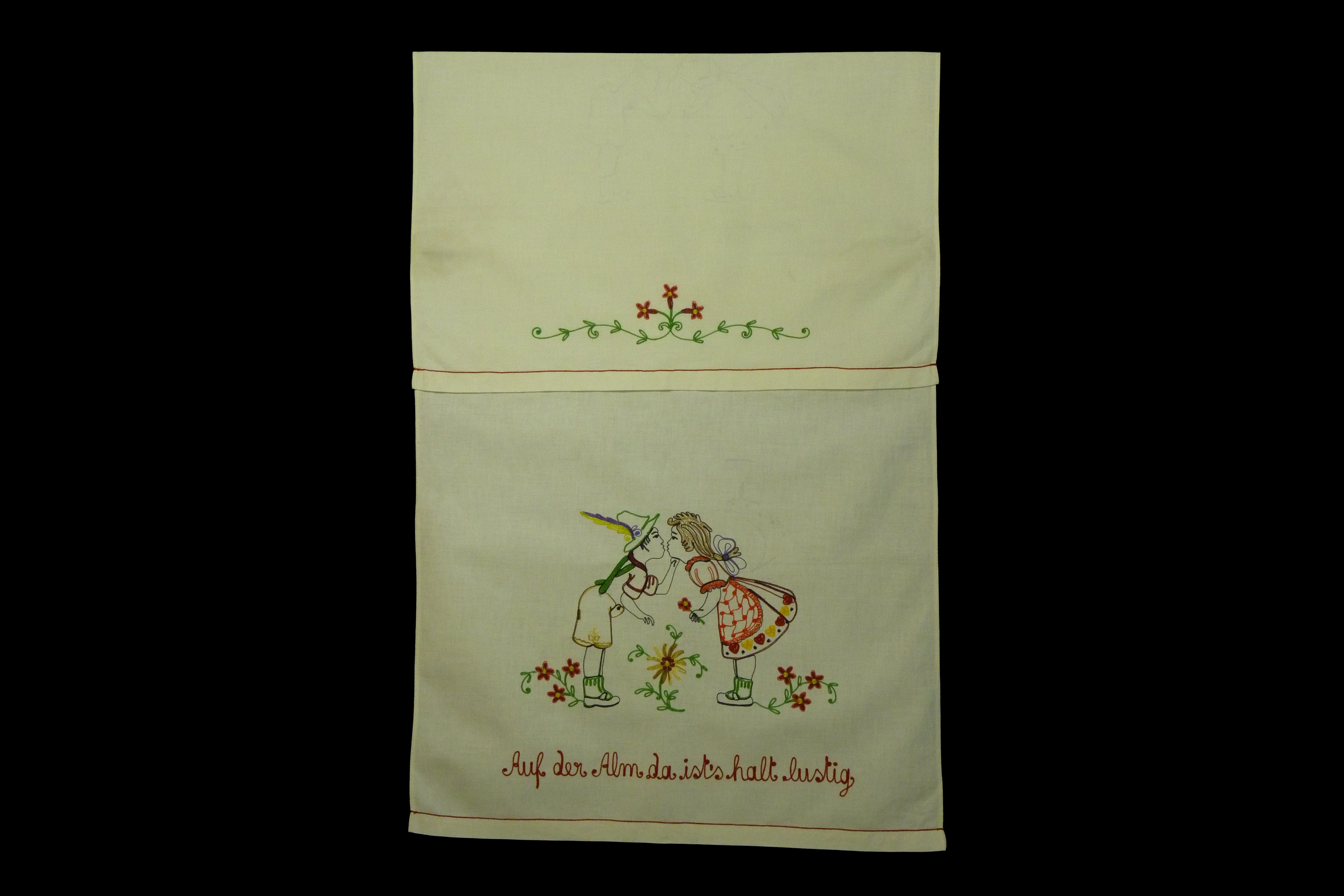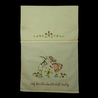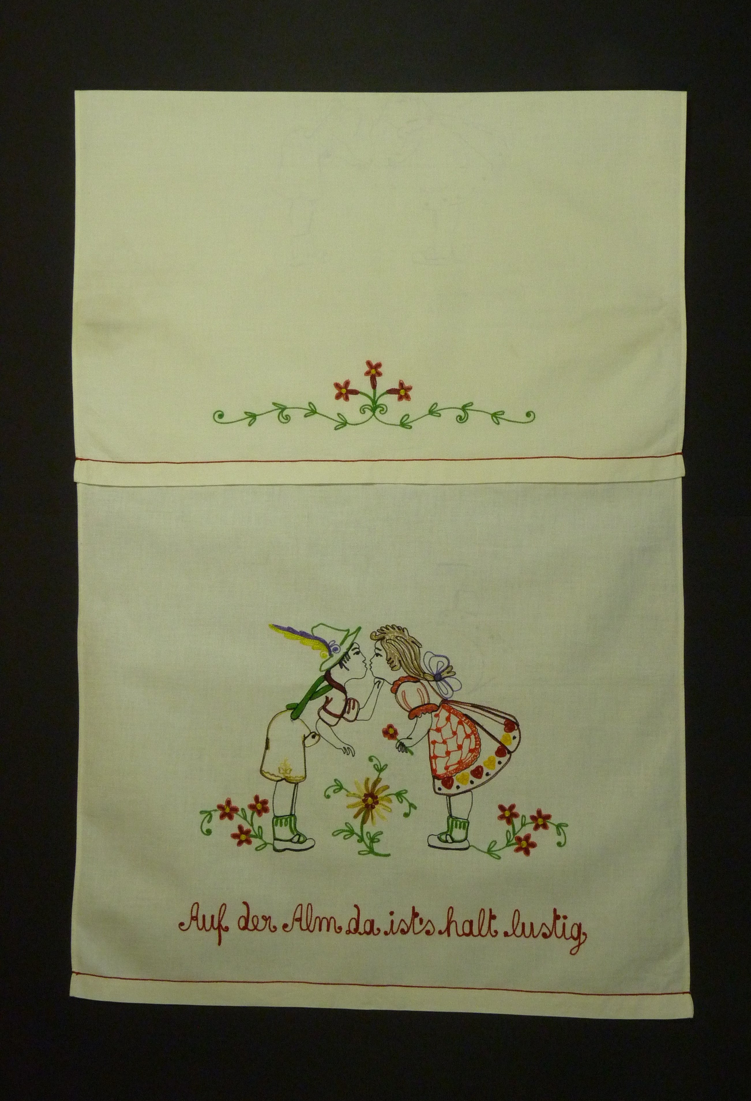 Kettenstich; glänzendes Garn in vielen Farben; Küssendes Pärchen; oberer Rand kleines Blumenmotiv;