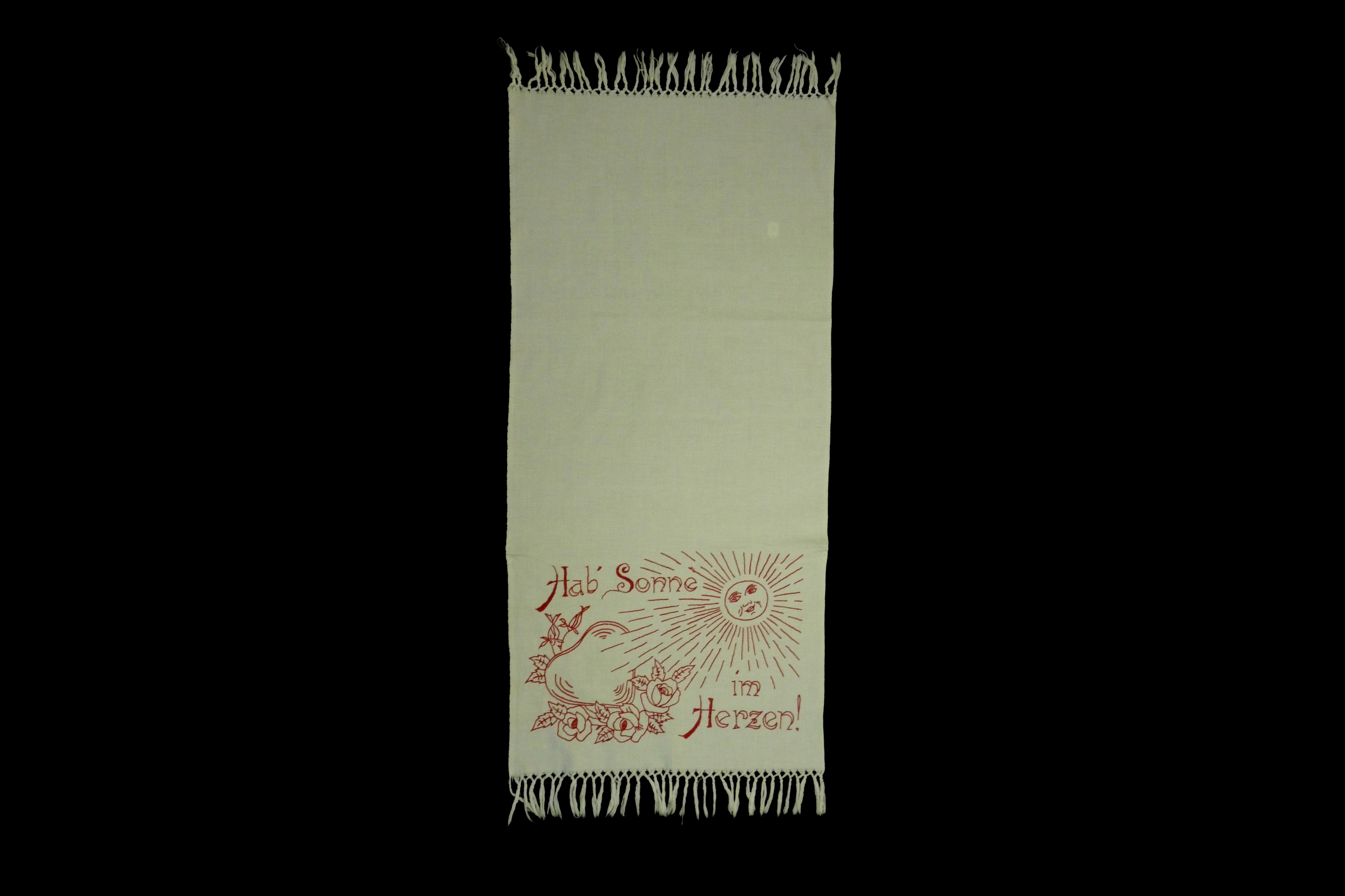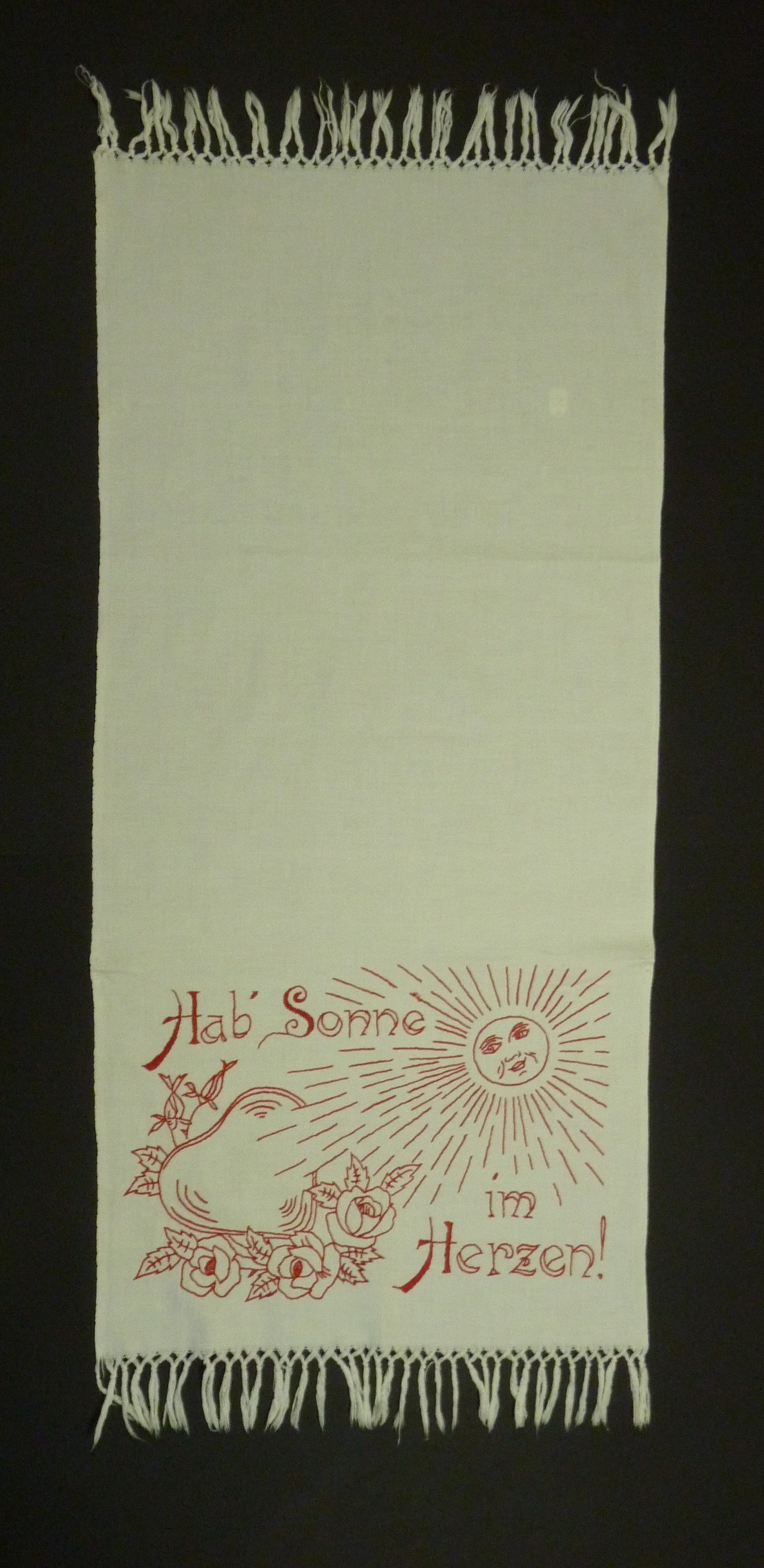 rot bestickt; Sonne, Herz, Rosen; Fransen;