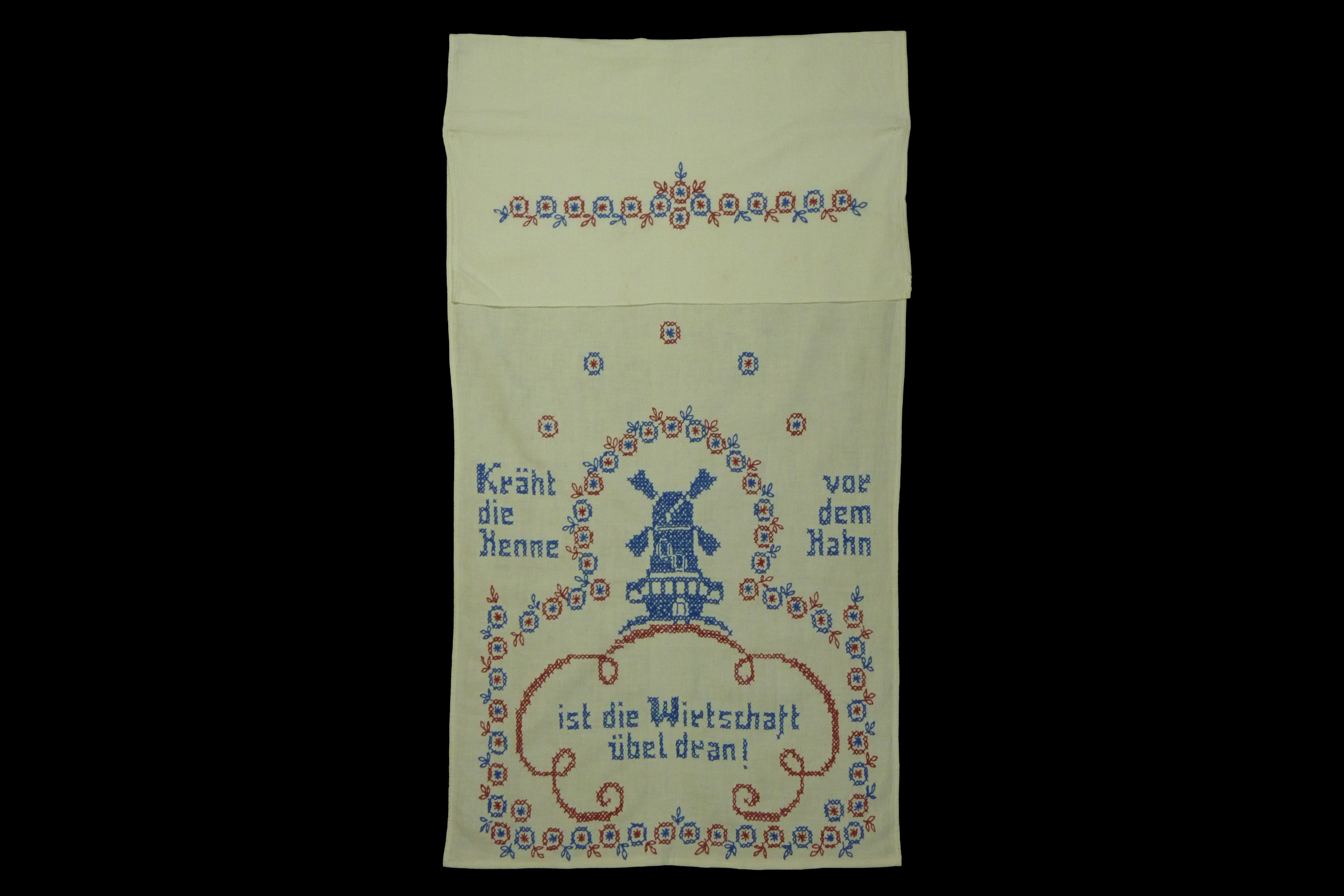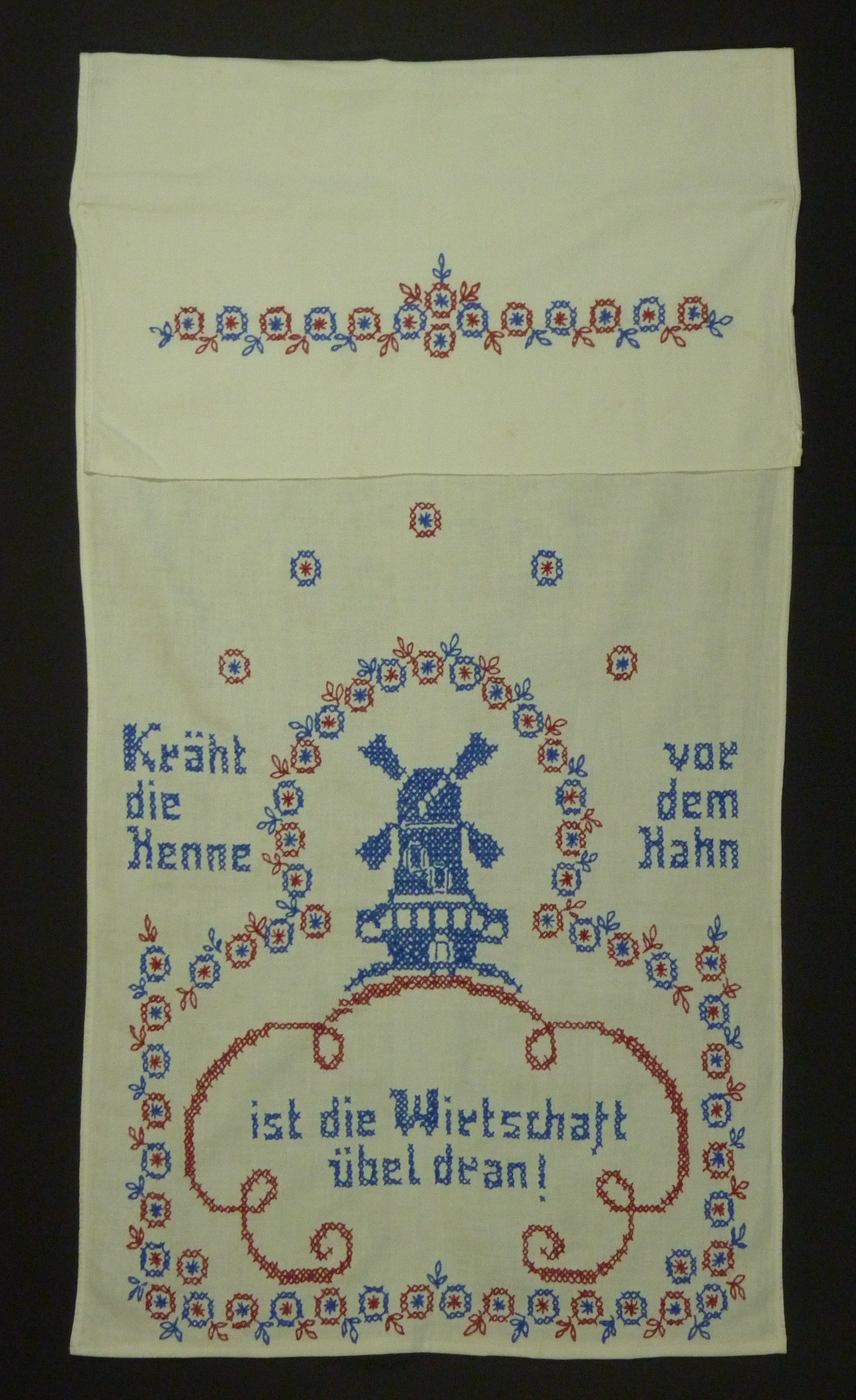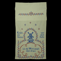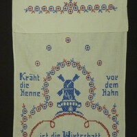 Kreuzstich; blau, rot bestickt; Hollandmotiv: Windmühle, Blumen;