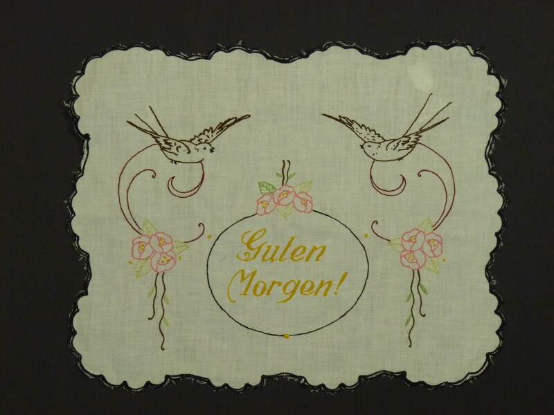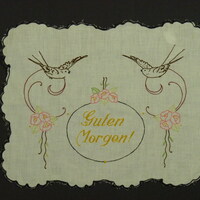 mit schwarzem Kettenstich eingefasst; Vögel und Blumen;