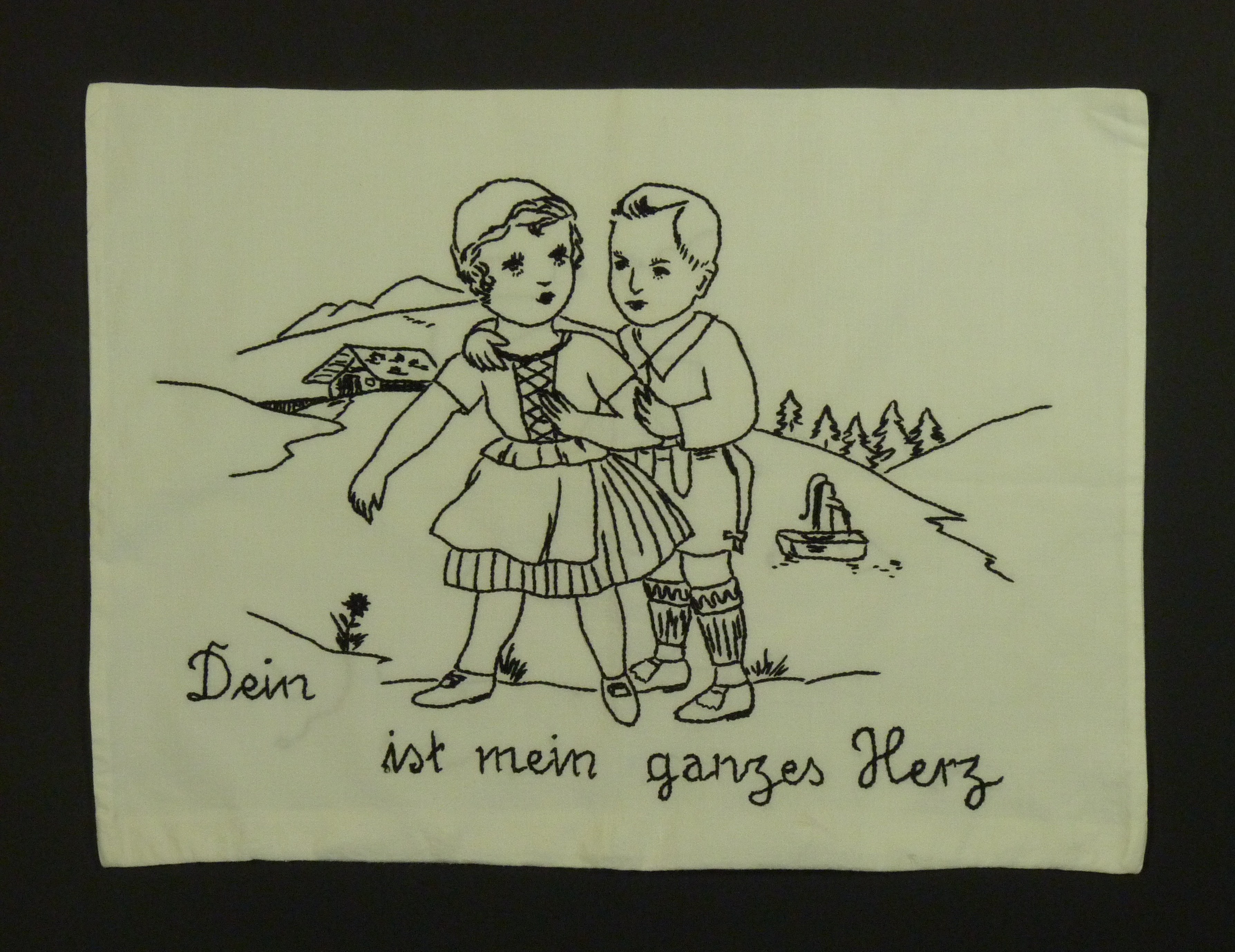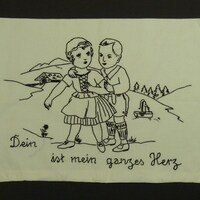 schwarz bestickt; Pärchen vor einer Landschaft;